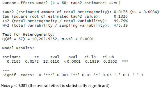 The foregoing results indicate substantial between-study variability, as the Q test was significant (Q(67), p < 0.0001). The I2 estimate (99.79%) suggests that nearly all observed variance reflects differences in effect sizes rather than sampling error. The pooled association, expressed as Fisher’s z = 0.2165, corresponds to Pearson’s r = 0.2132, representing the combined effect between the mental disorders reported across studies and overall social media use. This pooled effect differed significantly from zero (z = 12.6110, p < 0.0001).