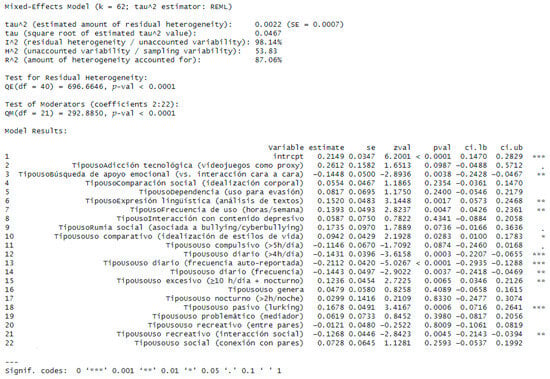 The meta-regression results display the categories of the TypeUse moderator. The intercept (intrcpt = 0.2149) remains close to the pooled effect estimated previously in the meta-analysis. Inclusion of Type Use explained >80% of the between-study variability (R2 = 87.06%). Despite the limitations noted, the findings suggest that exposure of adolescents and young adults to social media risk factors is associated with adverse mental-health outcomes. In aggregate, the results do not show null effects across the different types of social media use among adolescents (see Figure S1, Supplementary Material).
