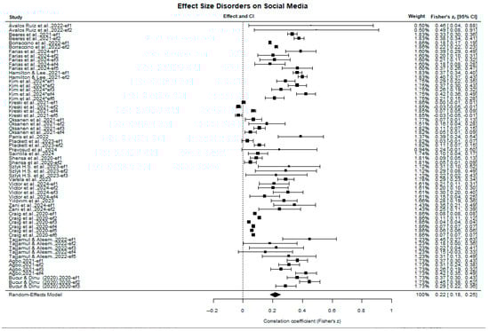 Forest plot of individual effect sizes and pooled effect (Fisher’s z), with 95% confidence intervals. The included studies are: (Ávalos Ruiz et al., 2022; Beeres et al., 2021; Borraccino et al., 2022; Farias et al., 2024; Hamilton & Lee, 2021; Kim et al., 2024; Kreski et al., 2021; Oksanen et al., 2021; Parris et al., 2022; Plackett et al., 2023; Pravosud et al., 2024; Saintila et al., 2024; Shensa et al., 2020; Szlyk et al., 2023; Varela et al., 2023; Victor et al., 2024; Yıldırım et al., 2023; Zani et al., 2024; Craig et al., 2020; Tajjamul & Aleem, 2022; Agbo, 2021; Bucur & Dinu, 2020).