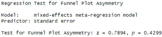 - Egger, M., Davey Smith, G., Schneider, M., & Minder, C. (1997). Bias in meta-analysis detected by a simple, graphical test. BMJ, 315(7109), 629–634. [Google Scholar] [CrossRef]