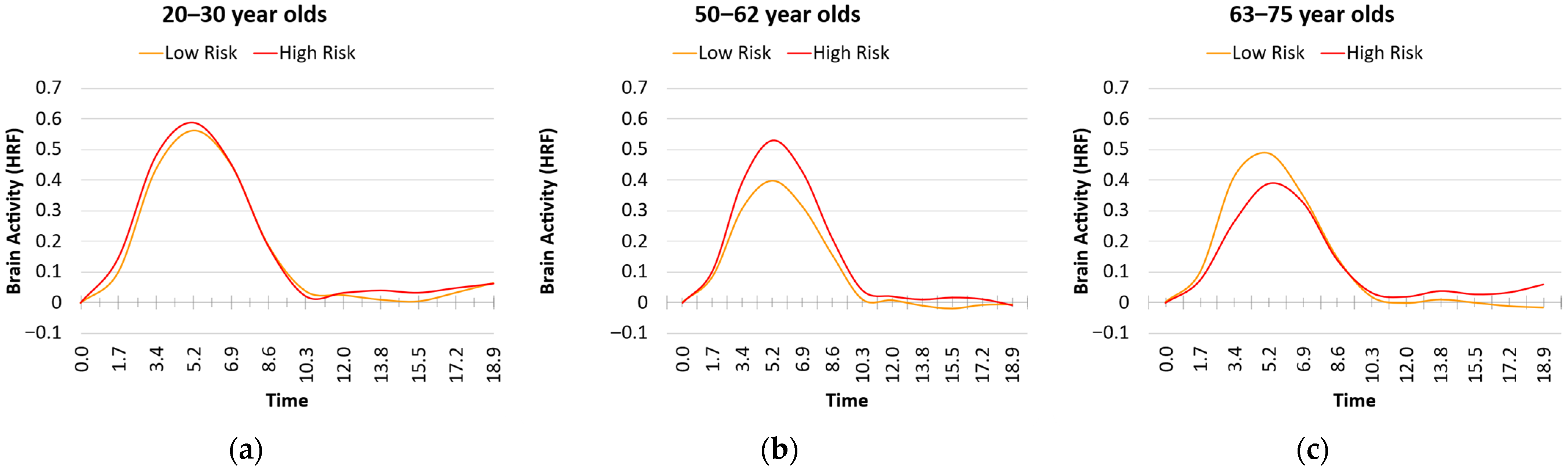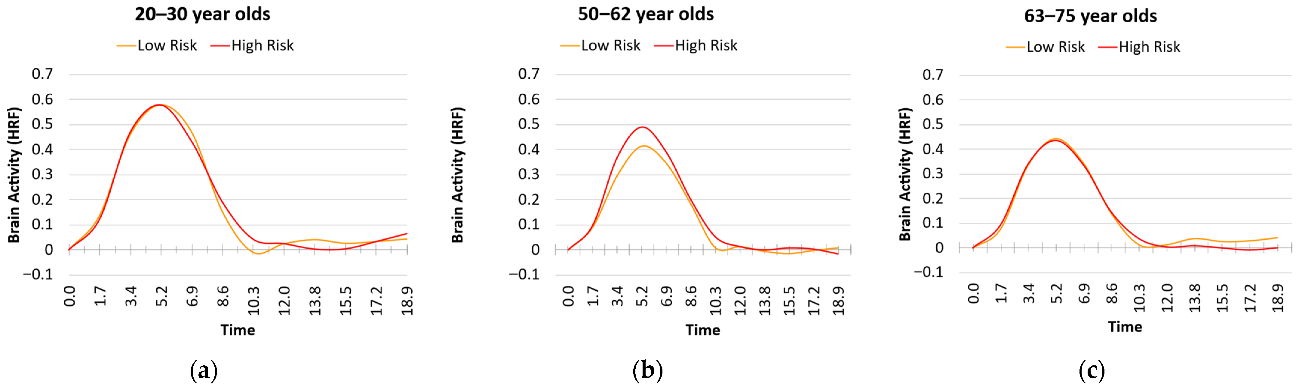 3.4. Age, Risk, and Analysis Type Effects on the Estimates of Brain Activity in the ROIs