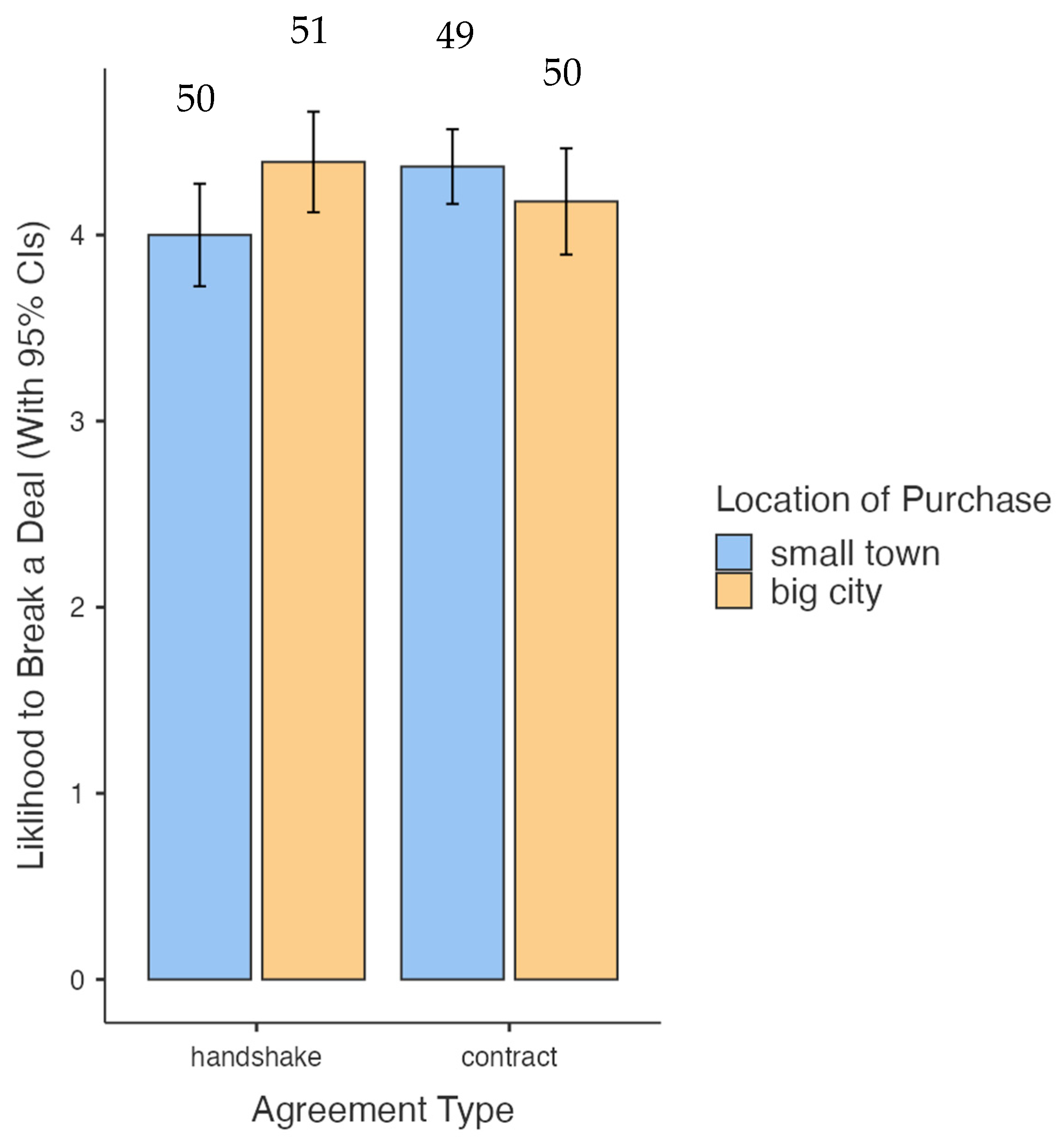 | Agreement Type | Location of Purchase | Likelihood of Breaking Deal (1–5) Mean | SD | N |