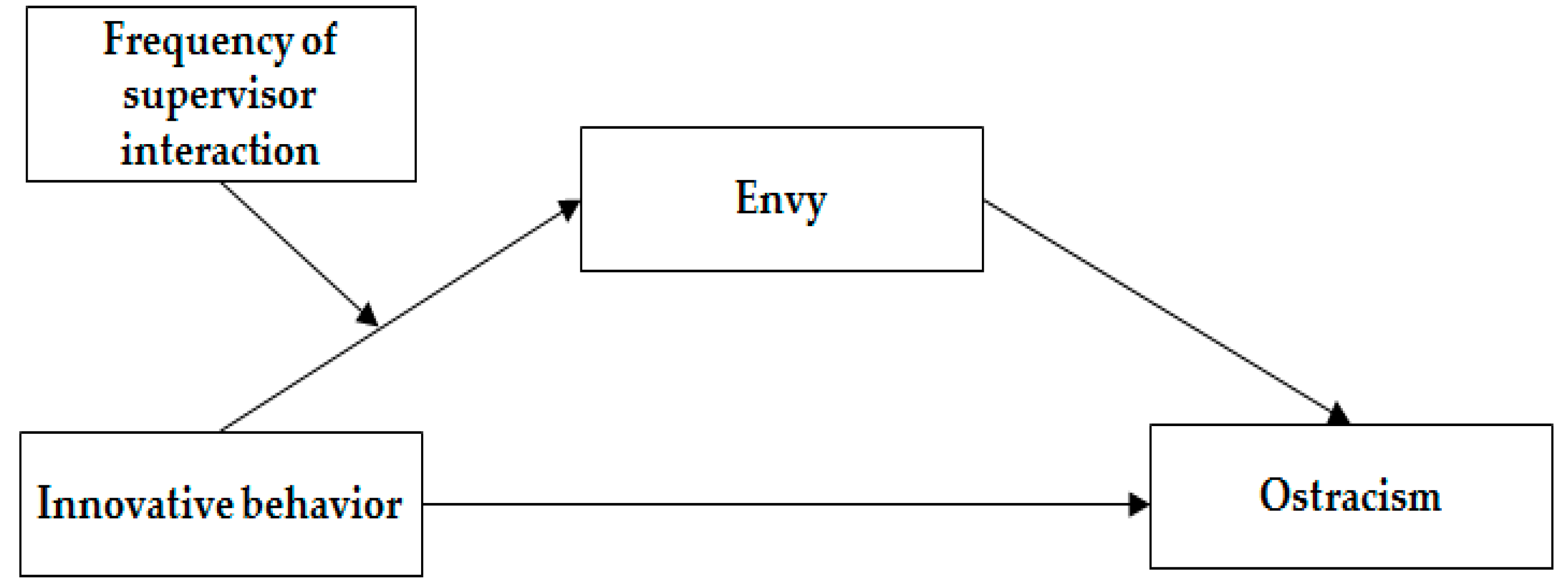 Hypothesis 3. The frequency of supervisor interaction strengthens the indirect negative effect of innovative behavior on ostracism through envy. That is, when supervisor interaction is frequent and of high quality, innovative behavior is more strongly associated with reduced ostracism via lower envy.