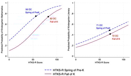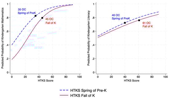 When HTKS was assessed during the fall of kindergarten (i.e., concurrent with achievement assessment), both effects were significant for the HTKS predicting achievement with the closest association to mathematics (b = 0.06, p < 0.001, OR = 1.07, CI [1.05, 1.08]), and then literacy (b = 0.02, p < 0.001, OR = 1.02, CI [1.01, 1.03]). Scoring a “0” on the HTKS was associated with a 0.18 probability of performing at kindergarten-level in mathematics and a 0.51 probability in literacy. For children scoring a “30” (1 SD below the mean), the probability increased to 0.60 for mathematics and 0.64 for literacy. And for children scoring a “84” (1 SD above the mean, the probability increases to 0.97 for mathematics and 0.83 for literacy. Figure 1 presents the predicted probabilities that children scored at kindergarten level in mathematics and literacy based on their HTKS score during the spring of prekindergarten and the fall of kindergarten.