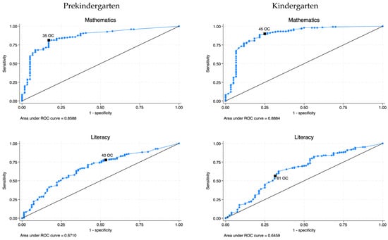 Cut-Score Information for the HTKS Predicting Kindergarten-Level Achievement. Consistent with the logistic regression results, cut-score analyses for the spring of prekindergarten showed that the largest AUC was observed for mathematics (0.82), and then literacy (0.65). Based on (), these AUC reflect moderate accuracy (0.70–0.90) for predicting kindergarten-level mathematics and low accuracy (0.50–0.70) for kindergarten-level literacy. For math, a score of “35” on the HTKS in the spring of prekindergarten was selected as the optimal cut-score according to the Youden Index J, with sensitivity of 0.81 and specificity of 0.83 (see Figure 2). Importantly, for children who score a “35” or better, the probability of them later performing at kindergarten level in mathematics is 0.95 (i.e., the precision). For literacy, a score of “40” on the HTKS was selected, with sensitivity of 0.71 and specificity of 0.58.