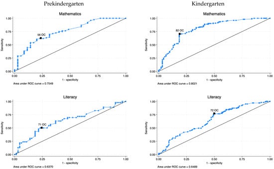 Cut score analyses optimize sensitivity and specificity and correctly identify individuals who are below or above a certain threshold. Although this method is common in medical fields (i.e., identifying diabetes), it can be applied to many fields, such as education. By using cut-score analyses, we can identify whether a child has necessary skills to be successful in school. Although what is meant by “successful” can carry many meanings, one aspect of success in early childhood includes whether a child performs at kindergarten level in achievement. This approach establishes a practical tool that can be used and interpreted by novel assessors and convey an impactful insight as opposed to linear trends, which may be difficult to interpret.