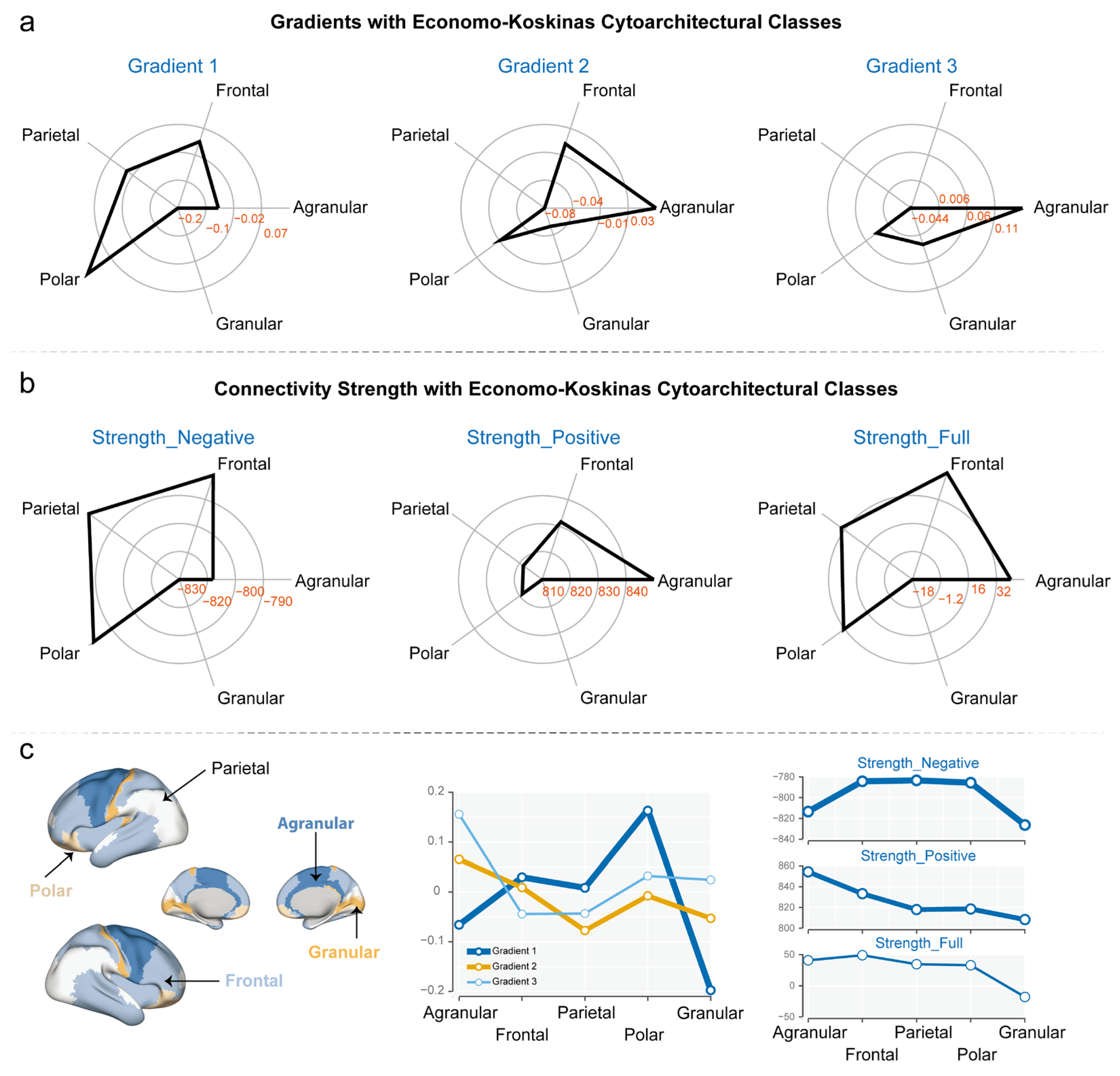 3.2. Gradients and Connectivity Strength with Economo–Koskinas Cytoarchitectural Classes