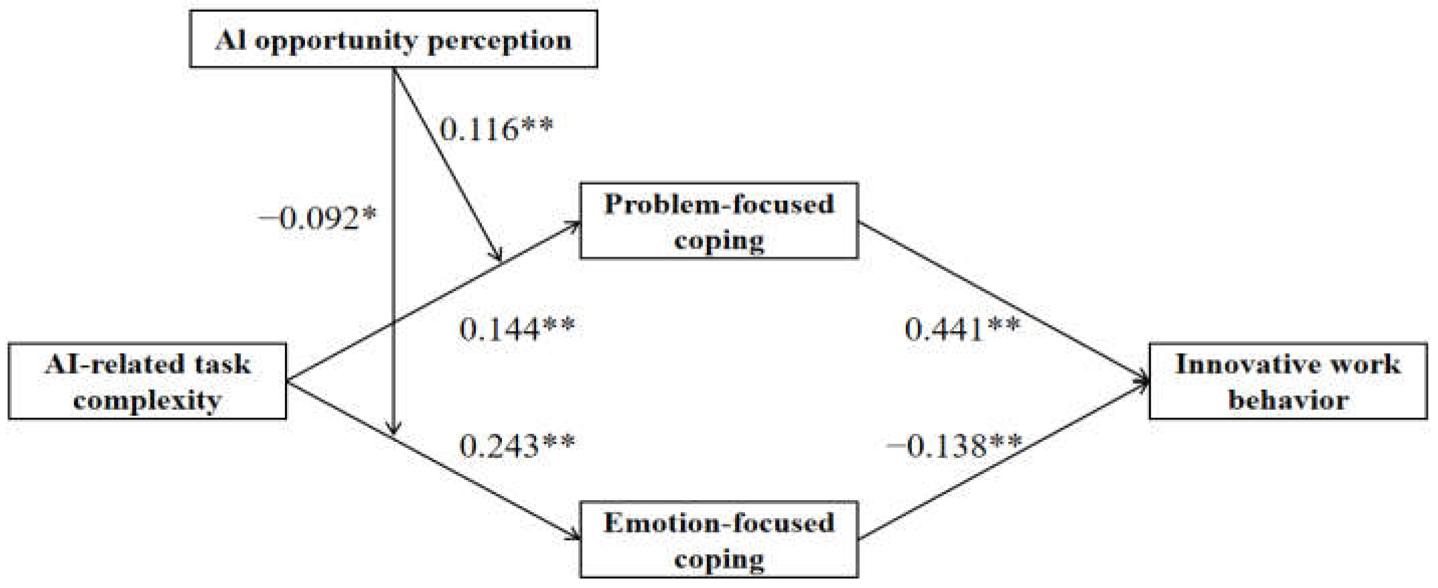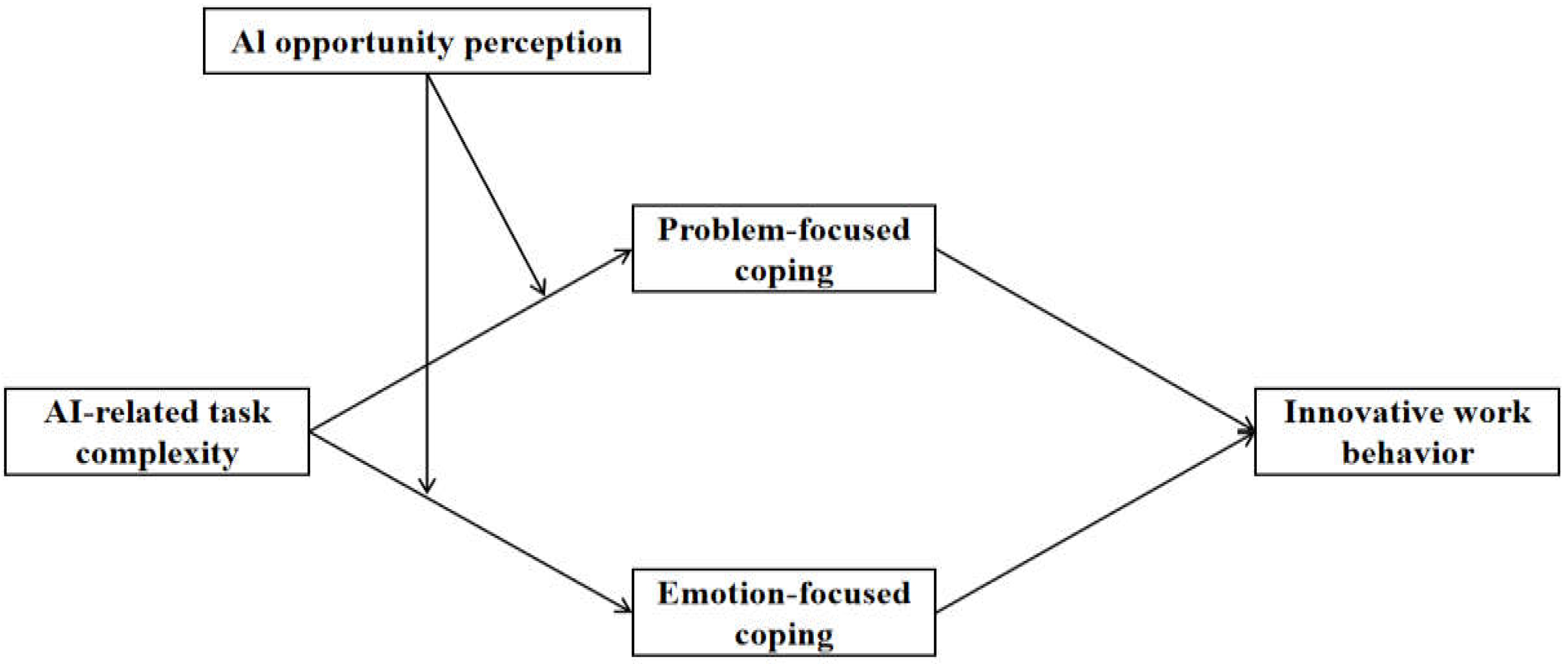 Based on coping theory, this study develops a moderated mediation model to investigate the mechanism through which AI-related task complexity influences employees’ innovative work behavior. Utilizing a three-wave time-lagged research design and analyzing data from 353 valid responses, the empirical results support the proposed moderated mediation model. The findings reveal that while AI-related task complexity can stimulate employees to adopt problem-focused coping strategies, it may also trigger emotion-focused coping, resulting in a dual-effect on innovative work behavior. Furthermore, the study demonstrates that AI opportunity perception plays a crucial moderating role in these pathways. When employees perceive higher levels of opportunities related to AI, it not only strengthens the positive effect of problem-focused coping on innovative work behavior but also effectively mitigates the negative impact of emotion-focused coping. On this basis, the discussion proceeds in three key aspects: theoretical contributions, practical implications, and research limitations.