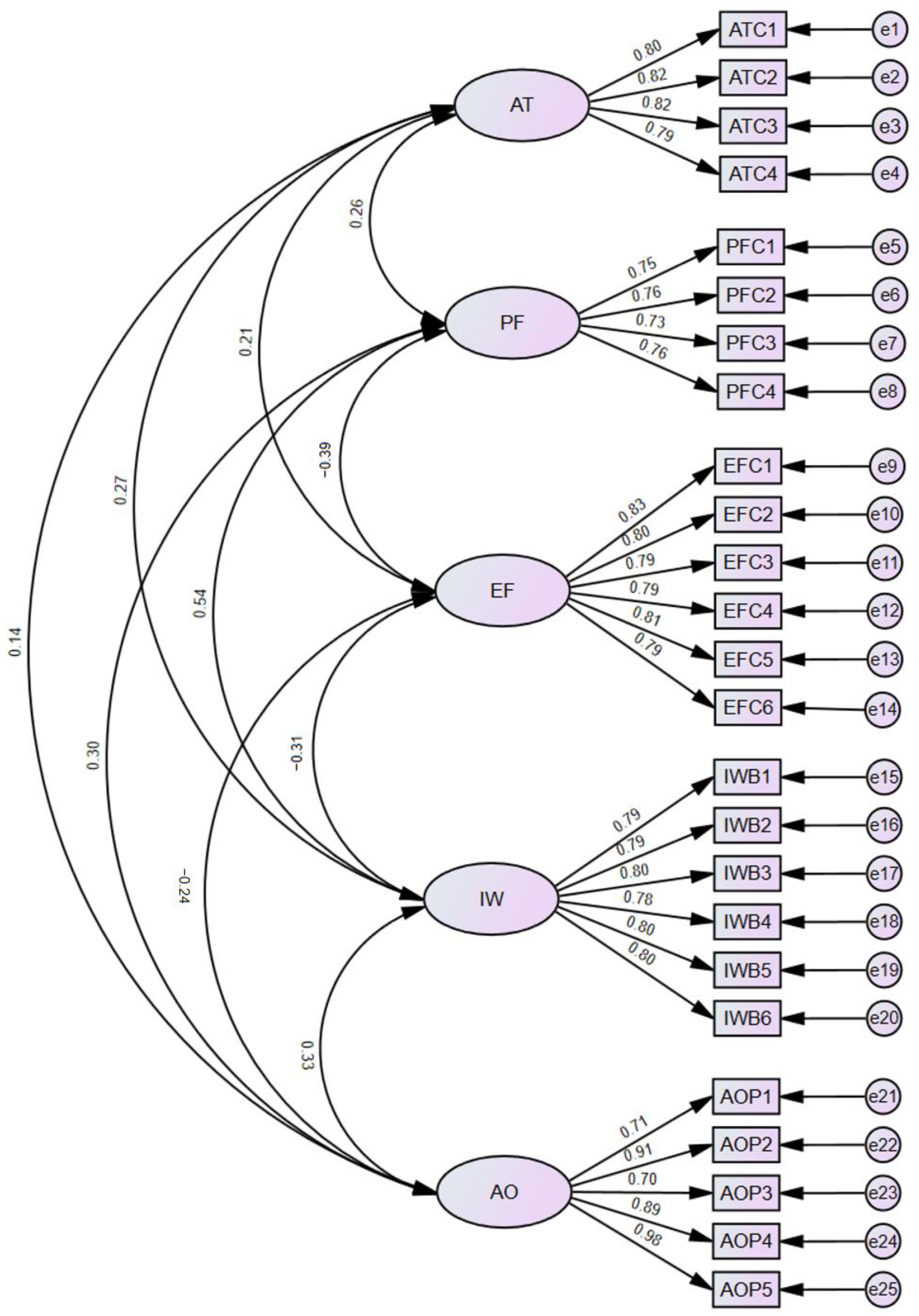 The statistical analyses were conducted using SPSS 26, AMOS 28 and Mplus 8.3. First, SPSS 26 and AMOS 28 were used to perform descriptive statistics as well as reliability and validity assessments. Reliability was evaluated by calculating Cronbach’s α, composite reliability (CR), and average variance extracted (AVE) to assess the internal consistency and reliability of the scales. Subsequently, exploratory factor analysis (EFA) was conducted to examine the structural validity of the scales, and the square roots of the AVE were used to assess discriminant validity. Next, confirmatory factor analysis (CFA) was performed using AMOS 28 to verify the consistency between the latent factor structure and the observed data. Model fit was evaluated using multiple indices, including RMSEA, CFI, GFI, IFI, and TLI, to determine the adequacy of model fit. Finally, structural equation modeling (SEM) was applied to test the hypothesized relationships. SEM enables the simultaneous estimation of relationships among latent variables and allows for the examination of both mediating and moderating effects. Through Mplus 8.3, the overall path model was constructed to systematically test the proposed hypotheses. The detailed empirical results are presented in the following sections.