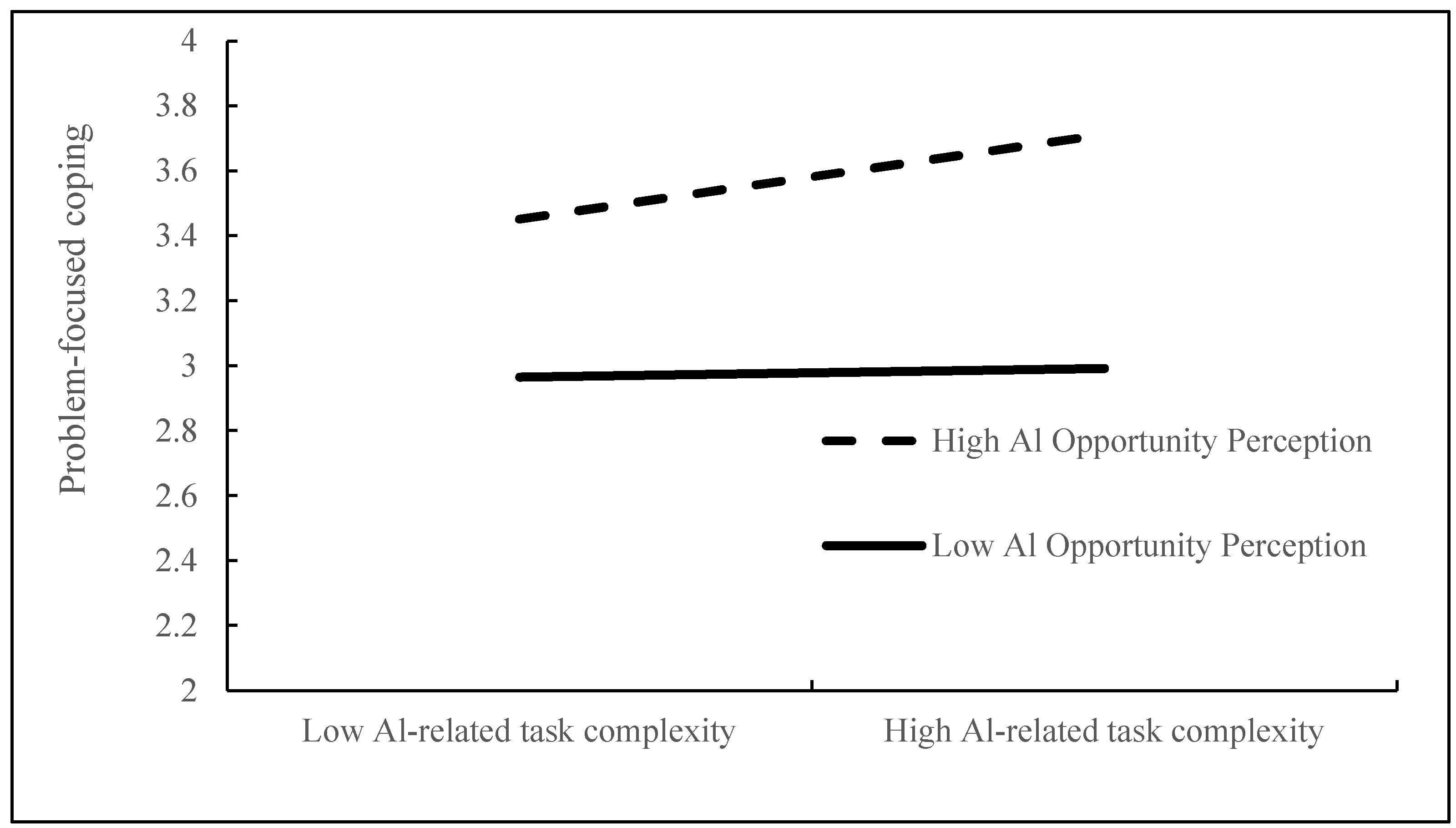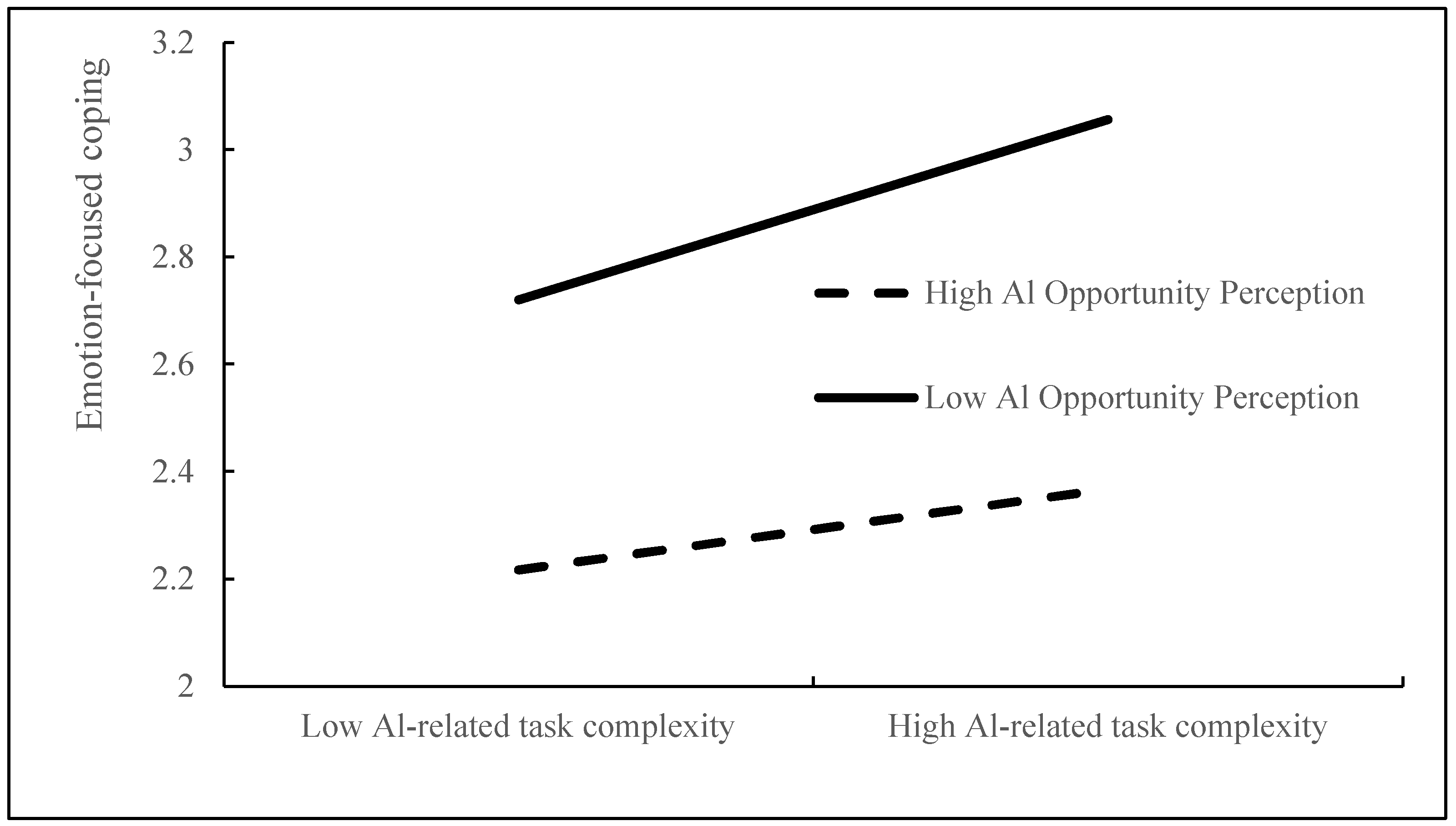 Demirci et al., 2025), little is known about how employees’ perceptions oriented toward opportunities help reframe task complexity and activate personal potential. This study finds that high levels of AI opportunity perception significantly strengthen the positive effect of problem-focused coping on innovative work behavior while simultaneously buffering the negative effect of emotion-focused coping. These insights enhance the contextual sensitivity of coping theory and offer a theoretical foundation for understanding how employees empower themselves through positive cognitive framing in the face of ongoing AI adoption.