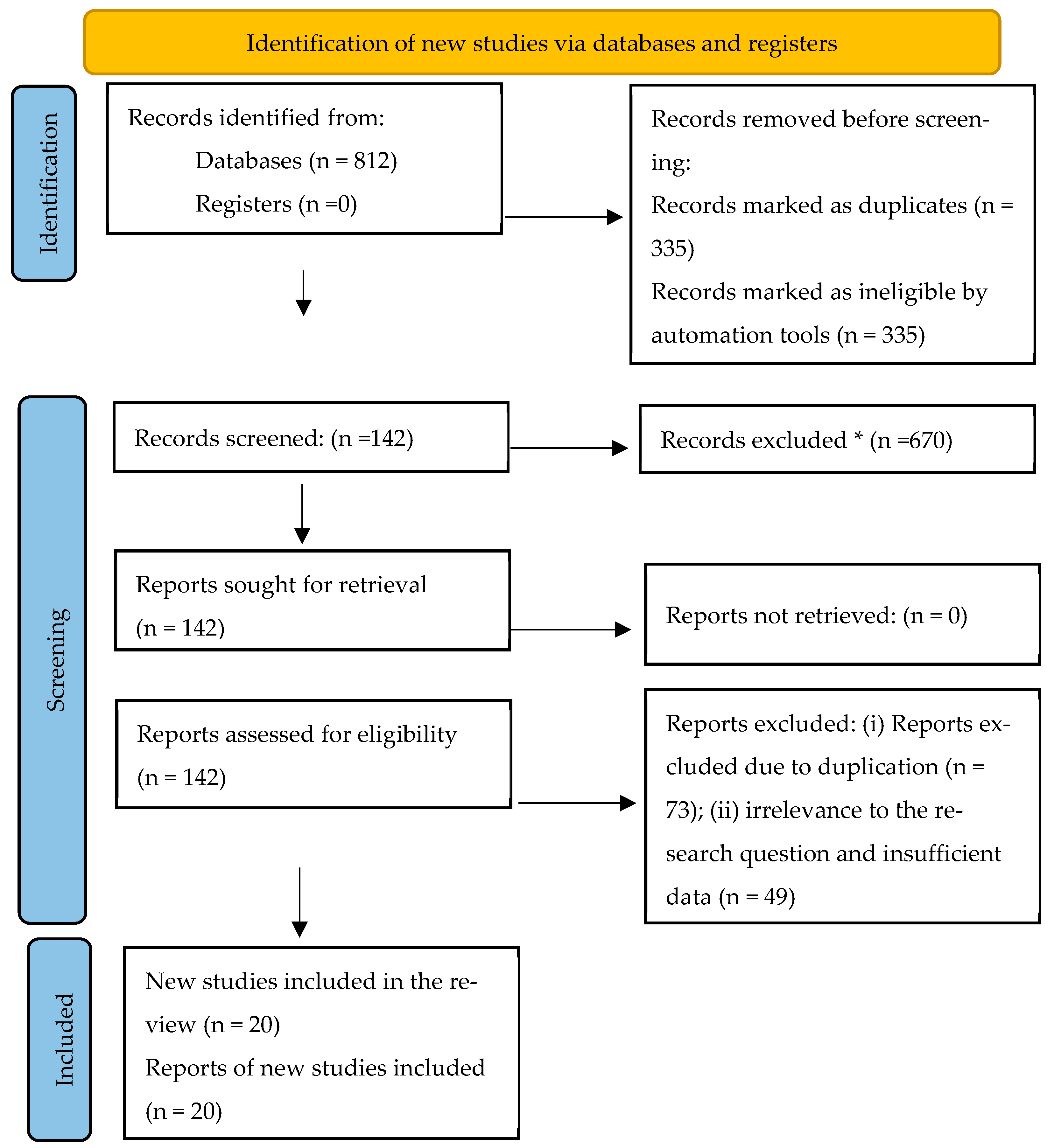 Figure 1). A total of 670 documents were discarded after screening the titles and abstracts. Subsequently, 142 unique records were evaluated using the inclusion and exclusion criteria. Ultimately, 20 studies met the established requirements.