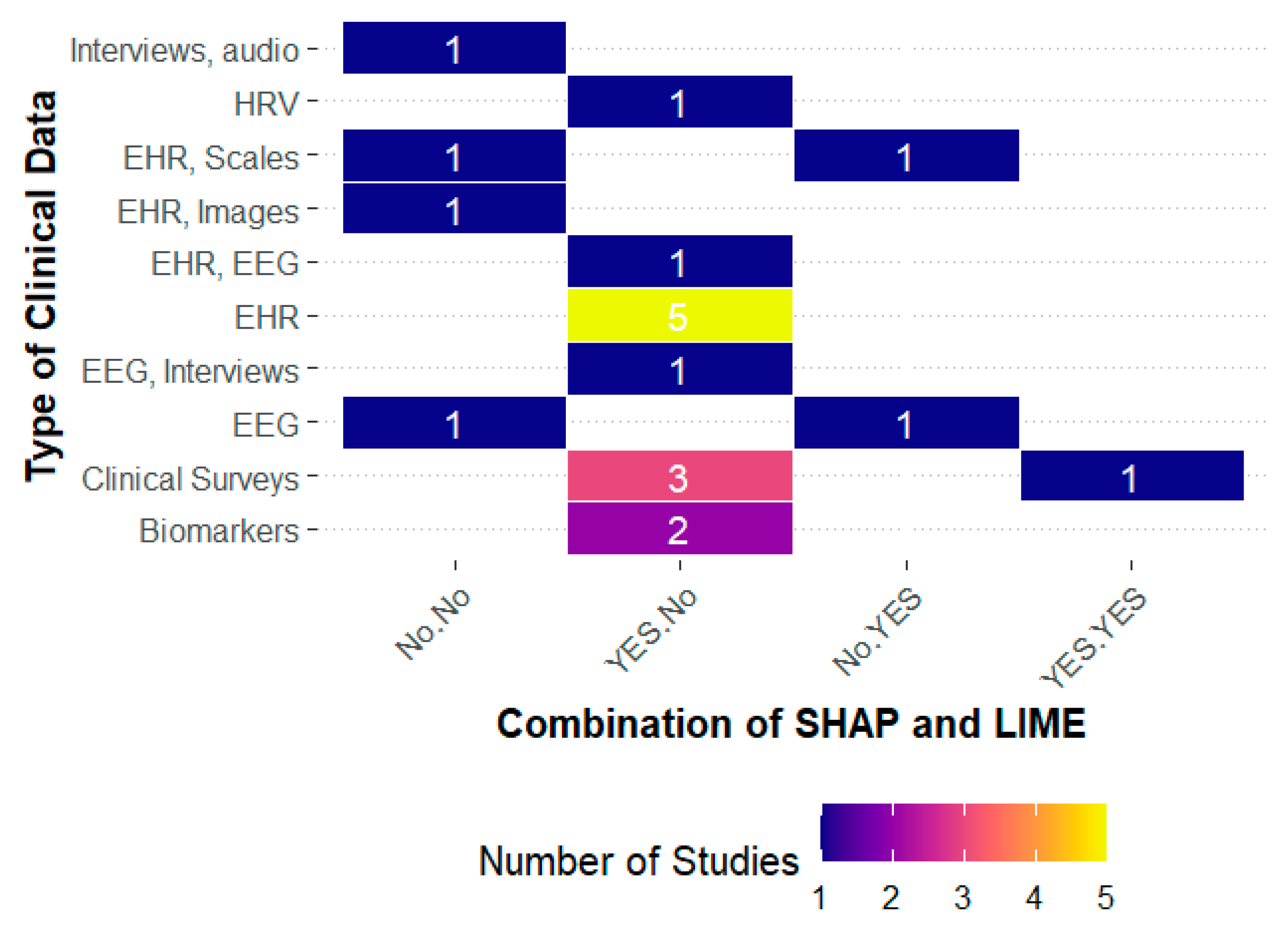 The relationship between interpretability techniques and types of clinical data confirms that their use is inconsistent. Studies using EHRs, clinical surveys, and biomarkers tend to favor SHAP (