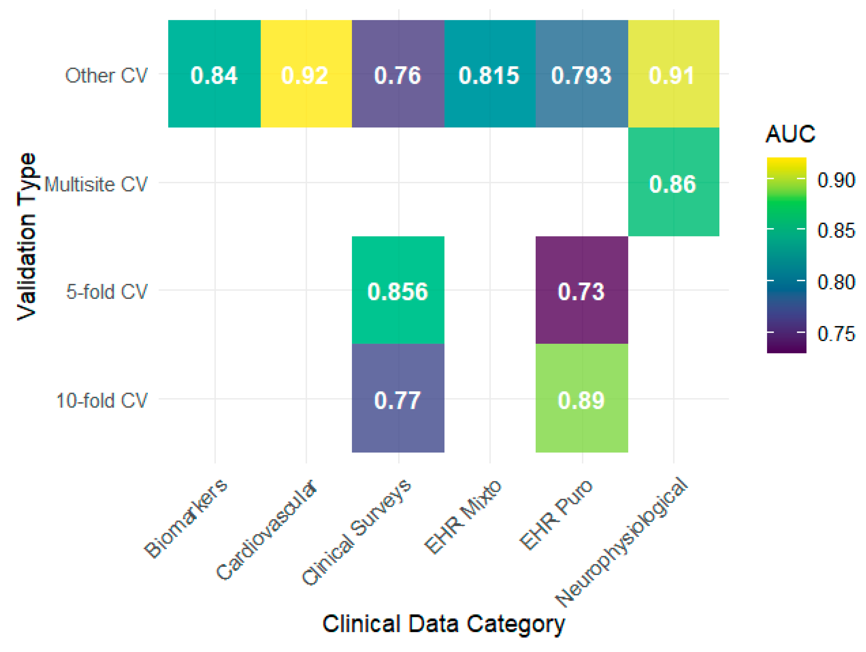 2024), whose use of clinical surveys showed modest performance compared with configurations with more structured EHRs. Regarding the AUC, the results tended to remain high, with notable peaks in biomarkers, neurophysiological data, and cardiovascular data reaching values close to 0.90, as observed by