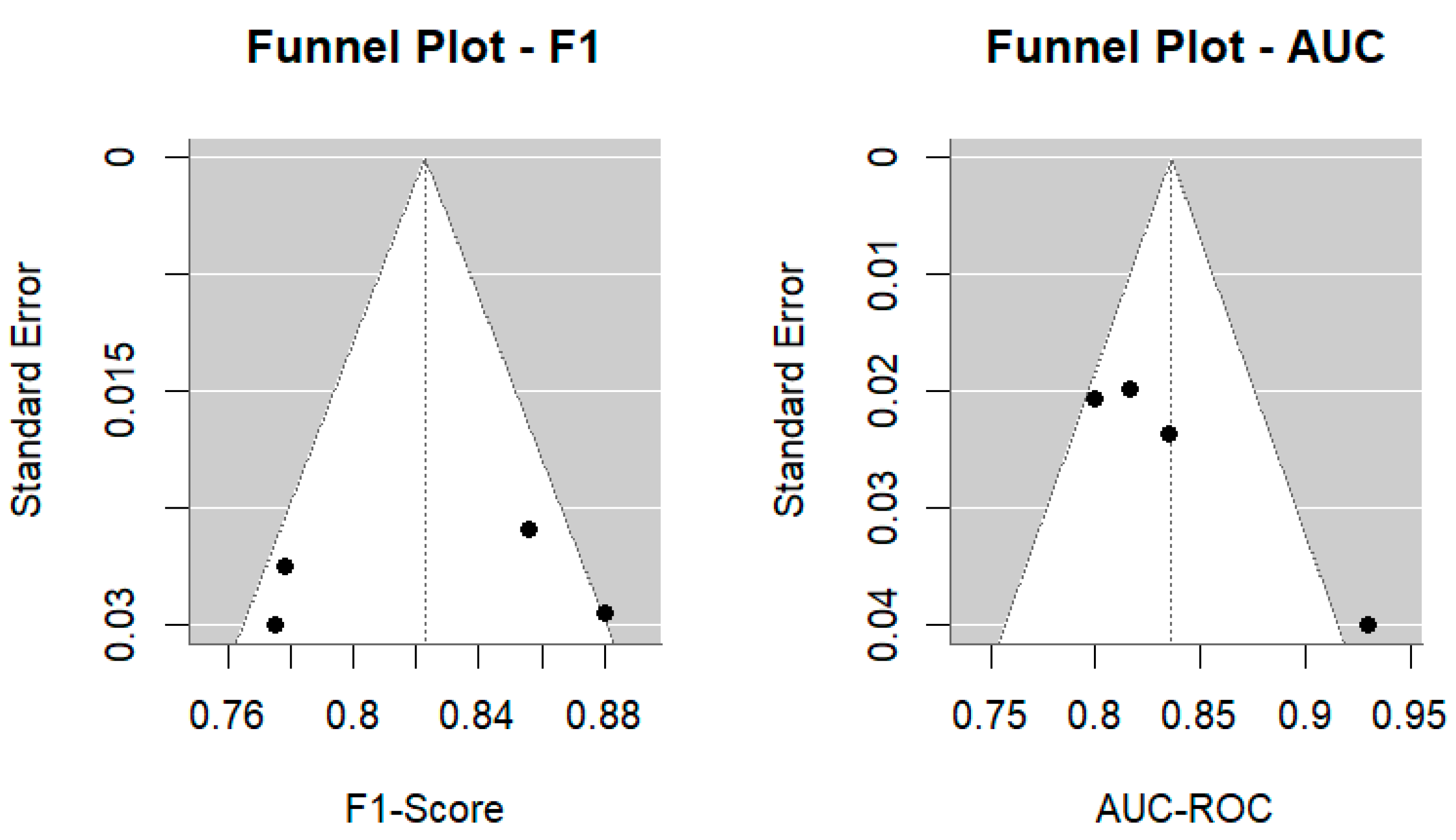 Funnel plots were generated for both the F1-Score and AUC-ROC to visually assess potential publication bias (
