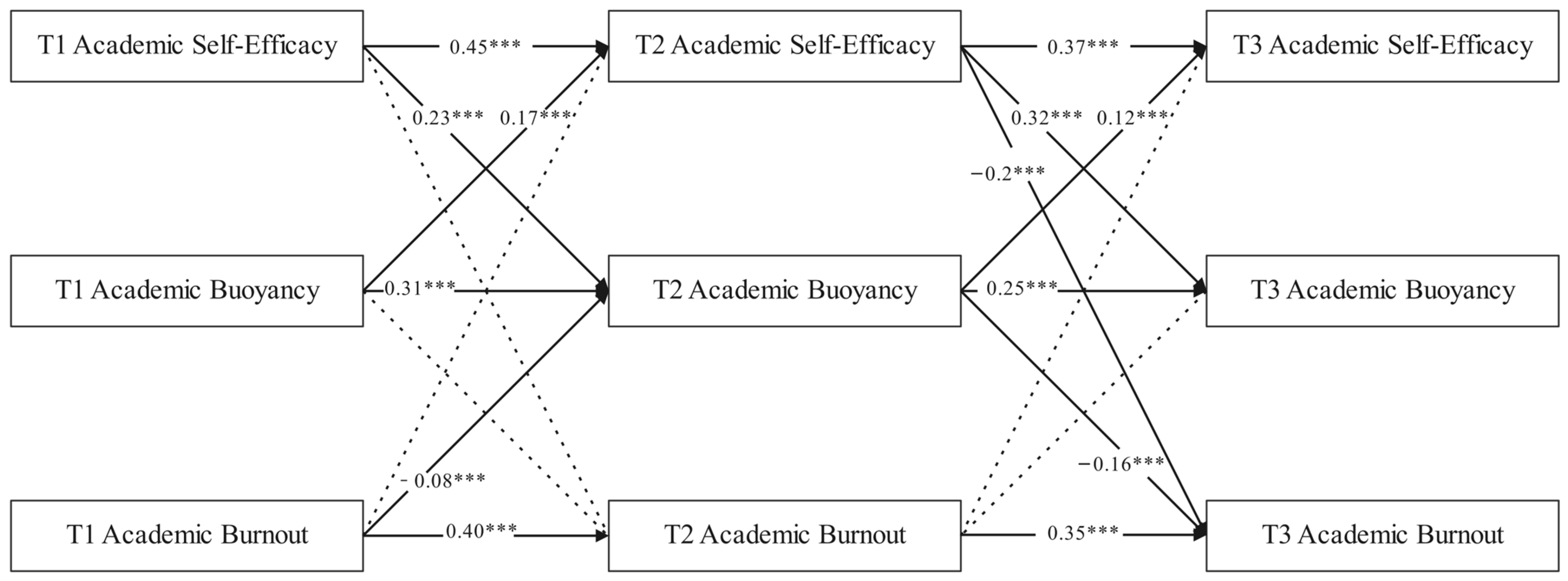 Table 2. There was a significant positive correlation between academic self-efficacy and academic buoyancy in the three measurements, and a significant negative correlation with academic burnout. There was also a significant negative correlation between academic buoyancy and academic burnout.