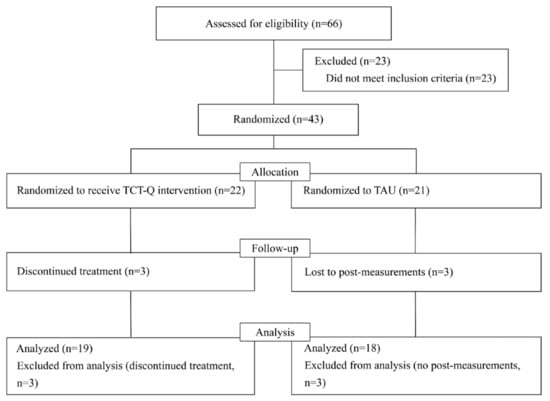 Results showed good overall feasibility: a total of 66 children were enrolled in this study, and 28 were excluded for not meeting the inclusion criteria (n = 23) or for dropping out (n = 6). Of the 37 eligible children, 19 received TCT-Q and 18 received TAU (Figure 1). After randomization, the dropout rate was 14% in both the TCT-Q group and the TAU group. The FoI of the TCT-Q was 92%.