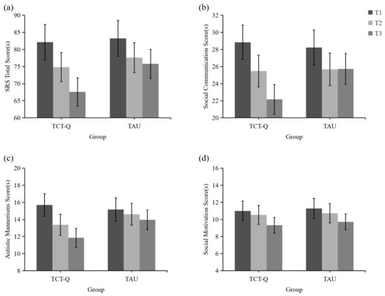 SRS scores of the two groups at three time points. (a) SRS Total scores; (b) Social Communication scores; (c) Autistic Mannerisms scores; (d) Social Motivation scores. TCT-Q: Three-Character Training of Question-Asking; TAU: Treatment As Usual. T1: before training, T2: after training, T3: three months after training.