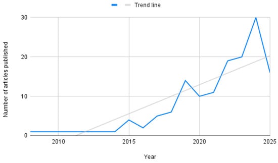In Figure 1, the annual publication trends are presented. First, it is clear that there was no emoji research in marketing before 2008. There is a clear separation between the early stages (2009–2014) with one study per year, a growth phase from 2015 to 2018, and an acceleration phase from 2019-today. The year 2024 was a peak year, and 2025 shows a decline because of incomplete data. In sum, emoji research in marketing and advertising is steadily growing, as the trend line shows.