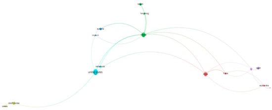 Looking at the next graph of co-authorship (Figure 5), we obtain a more comprehensive picture of country dynamics in the field. From the bigger nodes, we notice that authors from these countries have established collaborations, resulting in three clear clusters. From the above findings of the overview, the United States was the most prominent in terms of citations, but India and China have a central bridging role with collaborations.