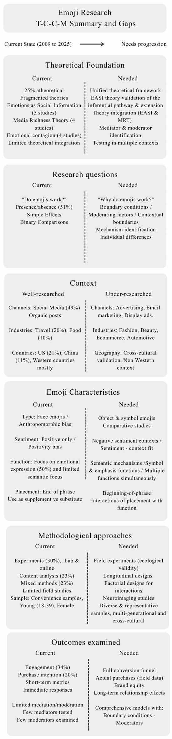 Despite their increasing integration into digital marketing strategy and the fact that they have been studied extensively in linguistics and psychology (Setyawan & Musthafa, 2024; Bai et al., 2019), research on emojis in marketing and advertising is scattered across studies, and multiple contexts, diverse methods and theoretical frameworks are observed. This fragmentation limits our ability to fully understand how, why, and with what results emojis are used in brand communication and creates obstacles for researchers and marketers. Because of the methodological and theoretical diversity of the field, without a systematic approach, researchers are prevented from establishing and using standard methods to assess emoji effects. Moreover, a systematic review would mitigate the scattered findings in the field and would shed light on the potentially more productive theoretical lenses to be used. On the other hand, despite the large volume of studies, practitioners now cannot make informed decisions about the use of emojis in their marketing strategies unless they study all available studies. Furthermore, since lower emphasis has been given to advertising contexts, marketers do not have evidence on how emojis work in persuasive speech. To sum up, the field needs a systematic study that unites existing knowledge so that both academics and practitioners can have a solid base for their future work.