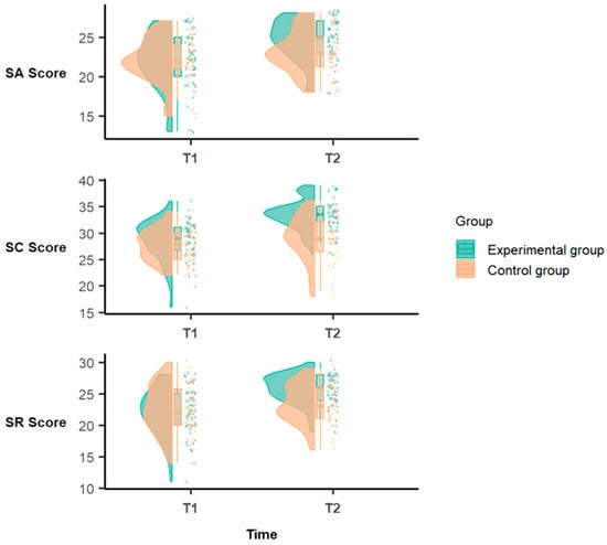 Changes in each dimension of autonomy among the children in the experimental and control groups before and after the intervention. Note: SA = self-assertion; SC = self-control; SR = self-reliance; Experimental group = Creative Dance group; Control group = DanceSport group; T1 = pre-intervention; T2 = post-intervention.