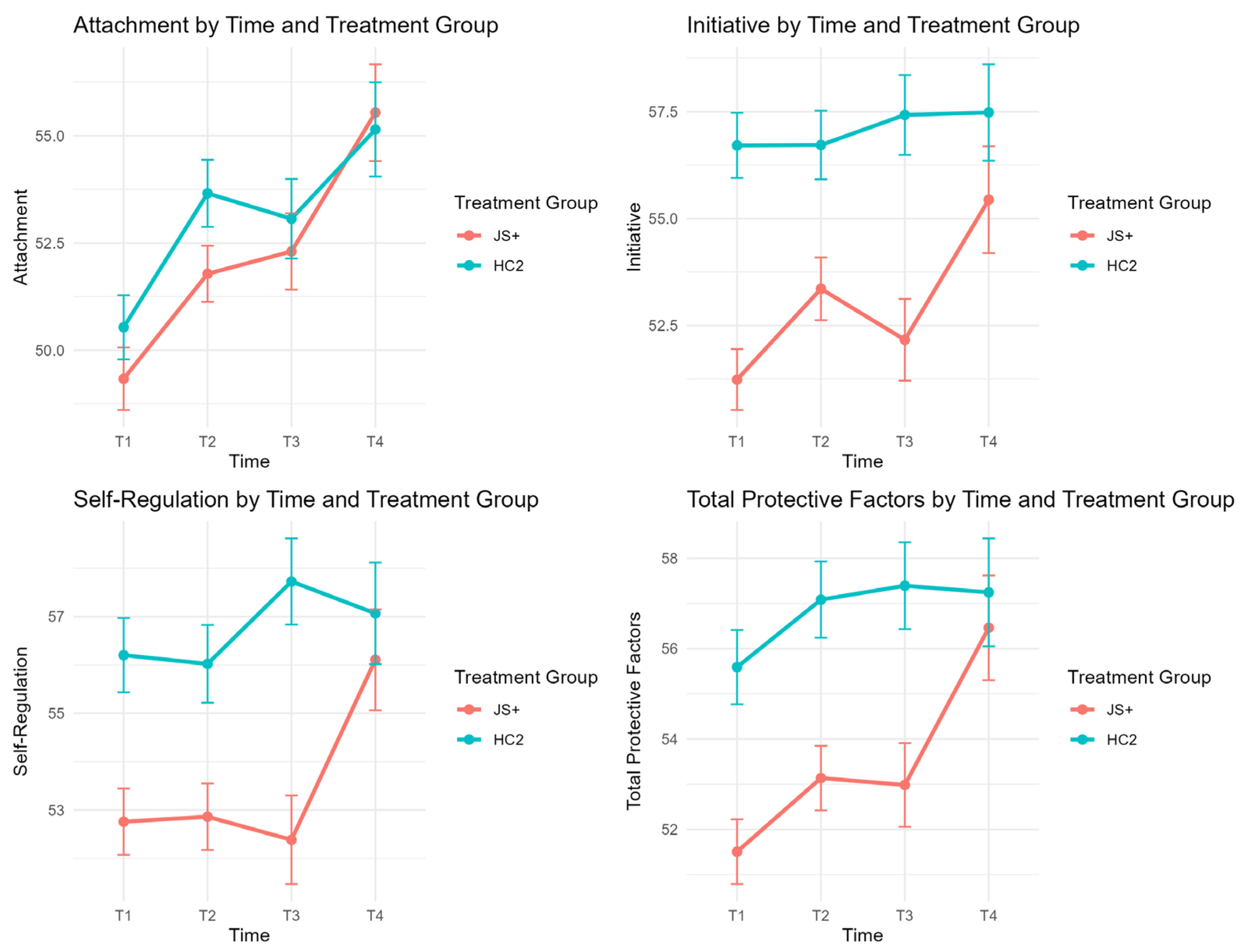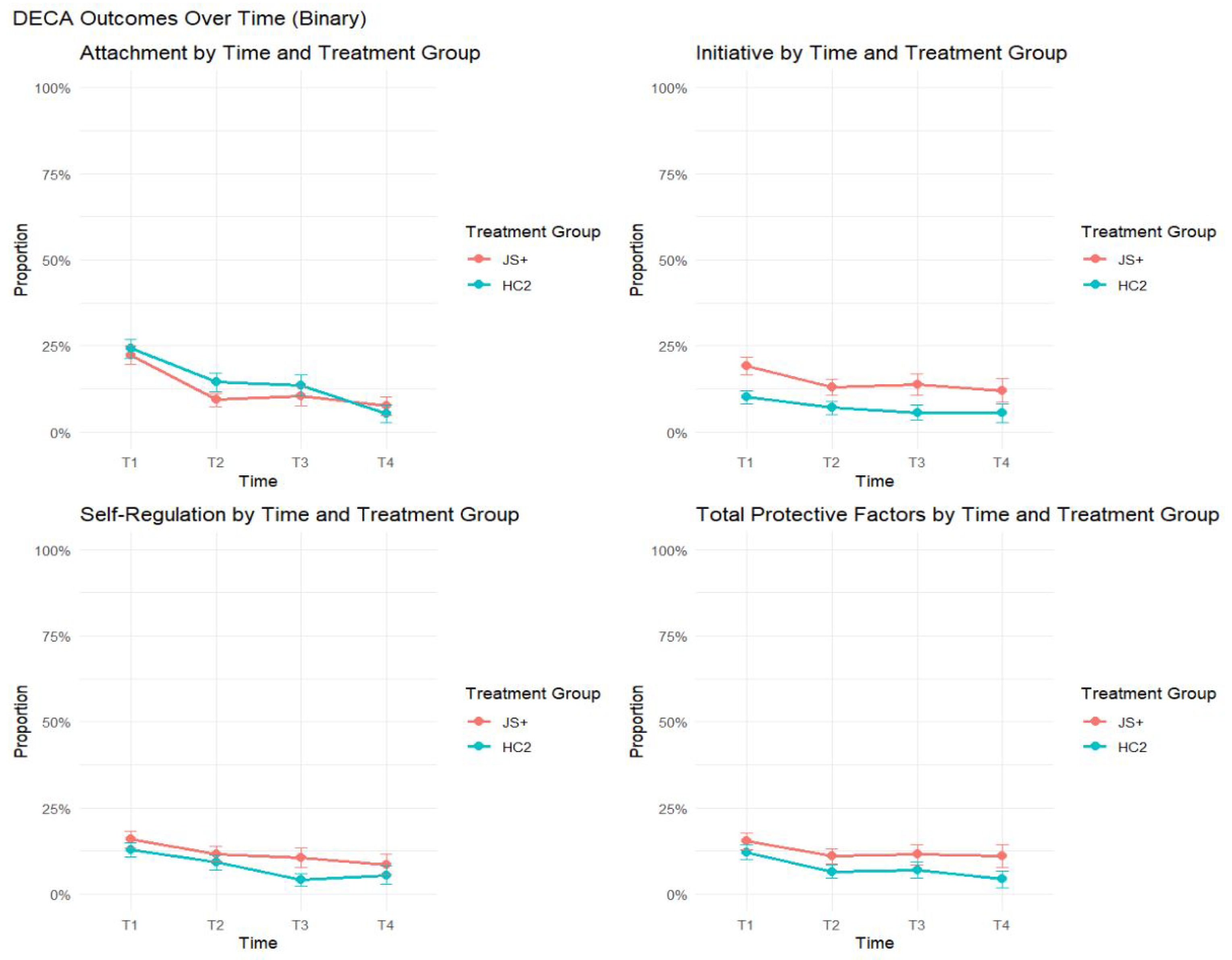Across all four time points, children in the HC2 group consistently demonstrated higher DECA scores than those in the JS+ group. After adjusting for baseline, covariates, and site clustering, for DECA Self-Regulation, the HC2 group showed significantly higher scores than JS+ with an adjusted mean difference of −2.21 (SE = 0.79, p = 0.0054, χ2 = 6.71). Similarly, DECA Initiative showed a significant treatment-by-time interaction (χ2 = 10.49, p = 0.0148) with group differences favoring HC2 at T4 (See Figure 2). GEE tests revealed a significant main effect of time for DECA Self-Regulation (p = 0.0054), with additional significant time-by-treatment interactions observed for DECA Initiative (p = 0.0148) and Self-Regulation (p = 0.0269), suggesting that these outcomes changed differentially over time by group (See Figure 2). That is, the rate of improvement was greater in the JS+CS group, demonstrating improved initiative and self-regulation, since the HC2 group maintained higher absolute mean scores for most of the time.