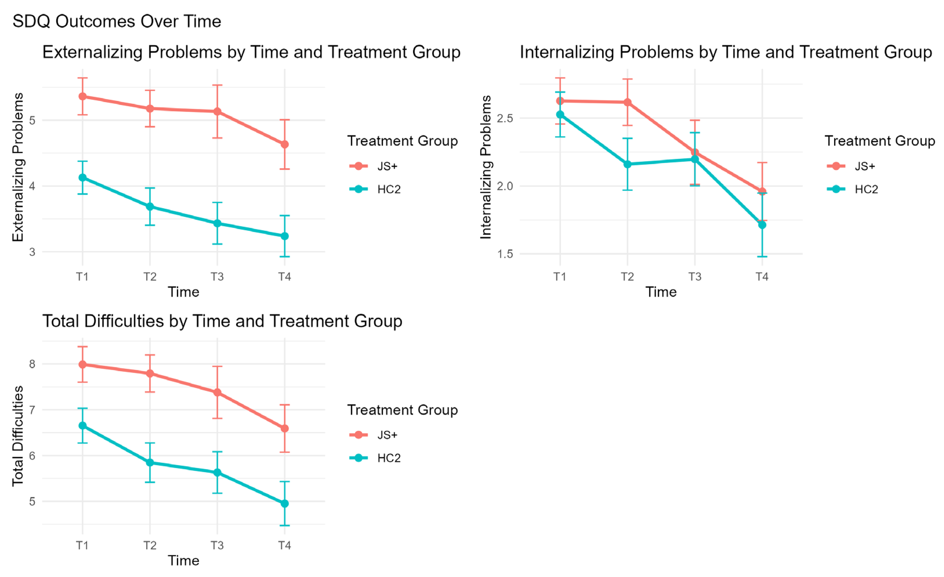 In terms of problem behavior outcomes, the JS+ group had statistically significantly higher SDQ Externalizing Problems (difference = 0.76, SE = 0.28, p = 0.0066, χ2 = 6.81) and significantly higher SDQ Total Difficulties (difference = 1.01, SE = 0.39, p = 0.0093, χ2 = 6.4), indicating more behavior problems in the JS+ group overall. A marginal difference was found for SDQ Internalizing Problems (difference = 0.31, SE = 0.18, p = 0.083, χ2 = 2.95) (See Figure 3). Again, these results indicate that the JS+ group started out with lower prosocial and higher problem behavior initially. No significant interactions were found for SDQ outcomes, indicating that trends over time were similar across groups (See Figure 3).