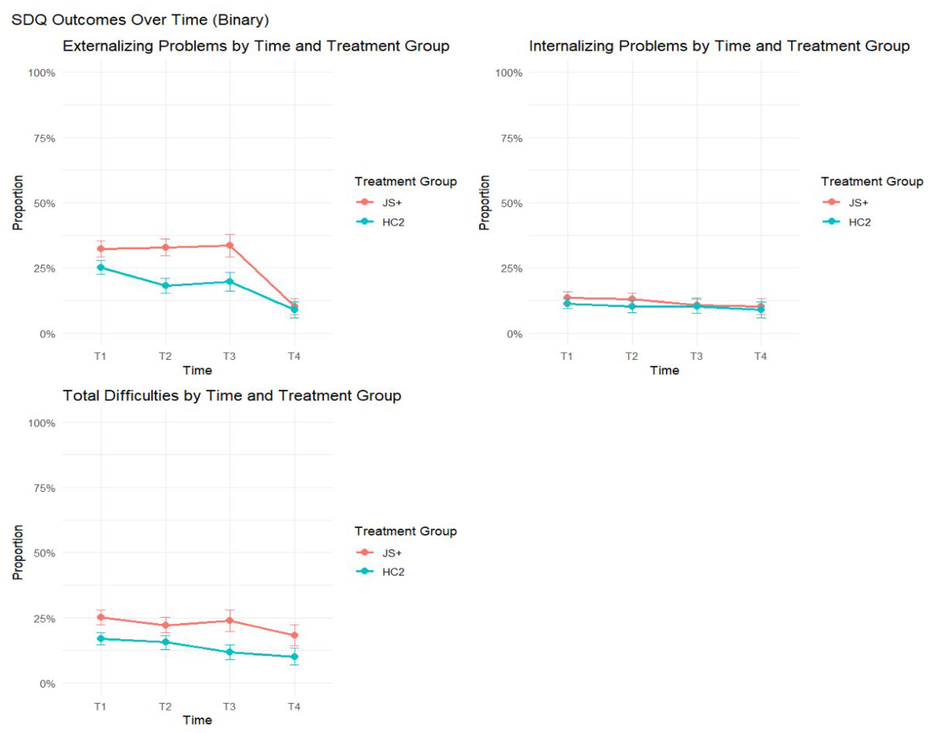When examining binary indicators of clinical levels of child prosocial skills and problem behaviors, there were no statistically significant differences between the JS+ and HC2 groups, either in overall treatment effects or treatment-by-time interactions (Table 3, Figure 4 and Figure 5). Both groups demonstrated gradual reductions over time in the proportion of children rated as experiencing clinically concerning levels, reflecting overall improvements in functioning. While the patterns were broadly consistent across binary SDQ and DECA outcomes, continuous outcome models showed that JS+ children exhibited greater gains over time in DECA Initiative and Self-Regulation compared to HC2 (Table 2, Figure 2), indicating some group differences in the trajectory of change even if not reflected in binary outcomes. Overall, the two groups showed similar patterns of change over time in clinical indicators, with both experiencing improvements, though some differential trends were observed in underlying continuous scores.