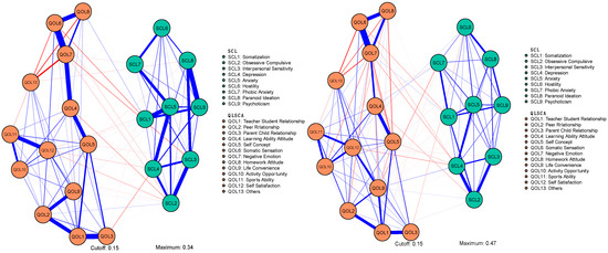 Quality of Life was assessed using the Chinese Quality of Life Scale for Children and Adolescents (QLSCA), which was locally developed to evaluate the subjective QoL of Chinese children and adolescents. The QLSCA consists of 49 items, which ultimately form four factors and 13 dimensions: (1) Social-Psychological Functioning (SPF), which includes relationships between teachers and students, between peers, between parents and children, learning ability and attitudes, and self-concept; (2) Physical-Mental Health (PMH), which includes physical sensations, negative emotions, and attitudes toward schoolwork; (3) Living Environment (LE), which includes things like how easy it is to get around, activities that are available, and exercise; and (4) Satisfaction with Life Quality (SLQ), which measures how happy a person is with themselves and other parts of their life overall. A five-point Likert scale is used to rate each item. Higher scores indicate better QoL. In this study, subscale totals were used as indicators of each dimension. In the network analysis, nodes were labelled according to these subscales, denoted as QOL1 to QOL13. The internal consistency of the QLSCA was also high, with a Cronbach’s α of 0.865.