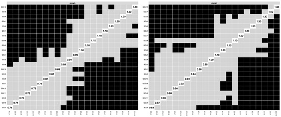 Figure 4 illustrates the accuracy of the edge weight estimation through the bootstrap method for both the non-cyberbullying group and the cyber-bullying group. As shown in the figure, both networks exhibited strong stability. The CS coefficients (Figure 5) indicate that, for both the non-cyberbullying and cyberbullying groups, the centrality indices were identical—0.749 for strength and 0.749 for expected influence—both exceeding the recommended threshold of 0.5. Figure 6 and Figure 7 present the results of the tests examining the differences in strength centrality and expected influence.