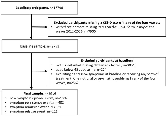 This study utilized the first four national waves of CHARLS data. We did not include the 2020 wave because the impact of COVID-19 on depressive symptoms could introduce potential bias. Our primary focus is on depressive symptoms during normal times, prior to the pandemic. The primary inclusion criterion for this study was individuals with complete scores on the Center for Epidemiologic Studies Depression Scale (CES-D) across all four waves. Participants with three or more missing items on the CES-D form in any wave were considered to have missing data. Further exclusion criteria of this study were as follows: (1) individuals aged below 45; (2) those who showed depressive symptoms at baseline or reported receiving any form of treatment for emotional or psychiatric problems—including psychiatric/psychological therapy, antidepressants, tranquilizers, sleeping pills or other medications—in any of the four waves; (3) individuals with a high rate (more than 30%) of missing data for risk factors, where imputation would be inaccurate. Based on these sample selection criteria, 3916 subjects were included for the final data analysis. Figure 1 shows a flow diagram of the study sample selection process.