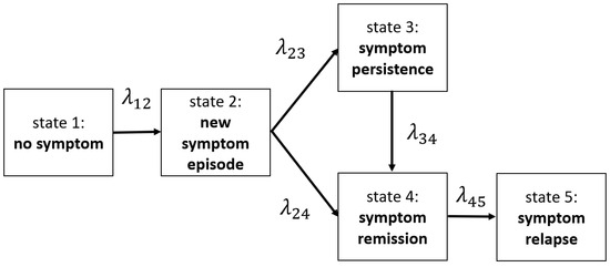 Illustration of the course of depressive symptoms with multi-state event diagram ( represents the risk of transition between different states).