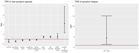 For females, currently feeling body pain and having difficulty with basic activity of daily living were significantly and positively associated with the risk of developing new symptom episode. Residing in urban areas, being retired, higher household income, and social engagement were associated with a significantly lower risk of a new symptom episode. As for the interaction terms, the positive effect of the number of conditions × income interaction suggests that the protective effect of income weakens as the number of chronic conditions increases. To be more specific, for individuals with a low number of chronic conditions, the protective effect of income dominates. As the number of chronic conditions increases, its effect attenuates the main effect of income. The negative effect of the education × income interaction suggests that the combined socio-economic advantage of higher education level and higher income was associated with a reduction in the risk of symptom onset. We also found that older females were more prone to symptom relapse based on the estimated effect of the sex × age interaction term.