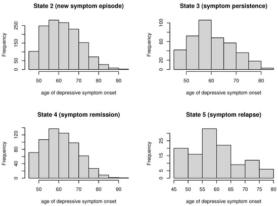 We further conducted an analysis to explore the potential role of age of symptom onset across the four symptom states: new symptom episode, symptom persistence, symptom remission and symptom relapse. Given that age-of-onset is undefined for participants who never exhibited significant symptoms during the study (individuals who were censored), it could not be incorporated as a baseline predictor in the multi-state model alongside other risk factors. We therefore conducted a descriptive analysis, examining its distribution for subjects who have experienced depressive symptoms during the study period. Visual comparison of the histograms (Figure 4) revealed that all distributions were slightly right-skewed, with a common peak occurring between 55–65 years of age. Using a threshold of 60 years (Corruble et al., 2008; Gallagher et al., 2009; Heun et al., 2000; Sachs-Ericsson et al., 2013) to distinguish early- from late-onset symptoms, we observed a higher frequency of early-onset cases among individuals in the persistent and relapse states. This suggests that an earlier onset is associated with a higher risk of symptom chronicity or recurrence.