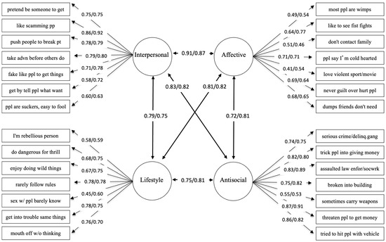 Multiple group confirmatory factor analysis results: standardized parameters (men/women) for the four-factor SRP-SF model.
