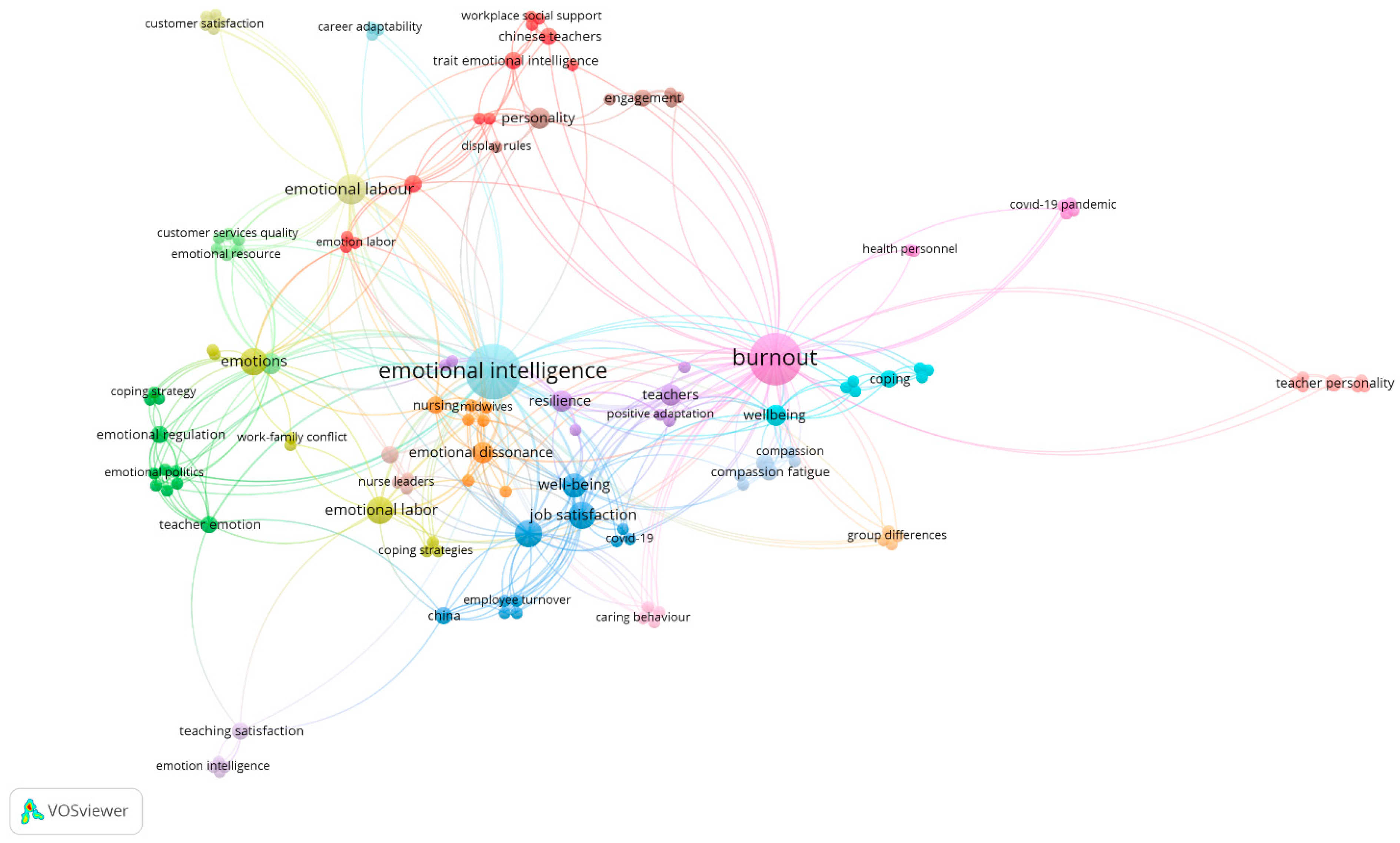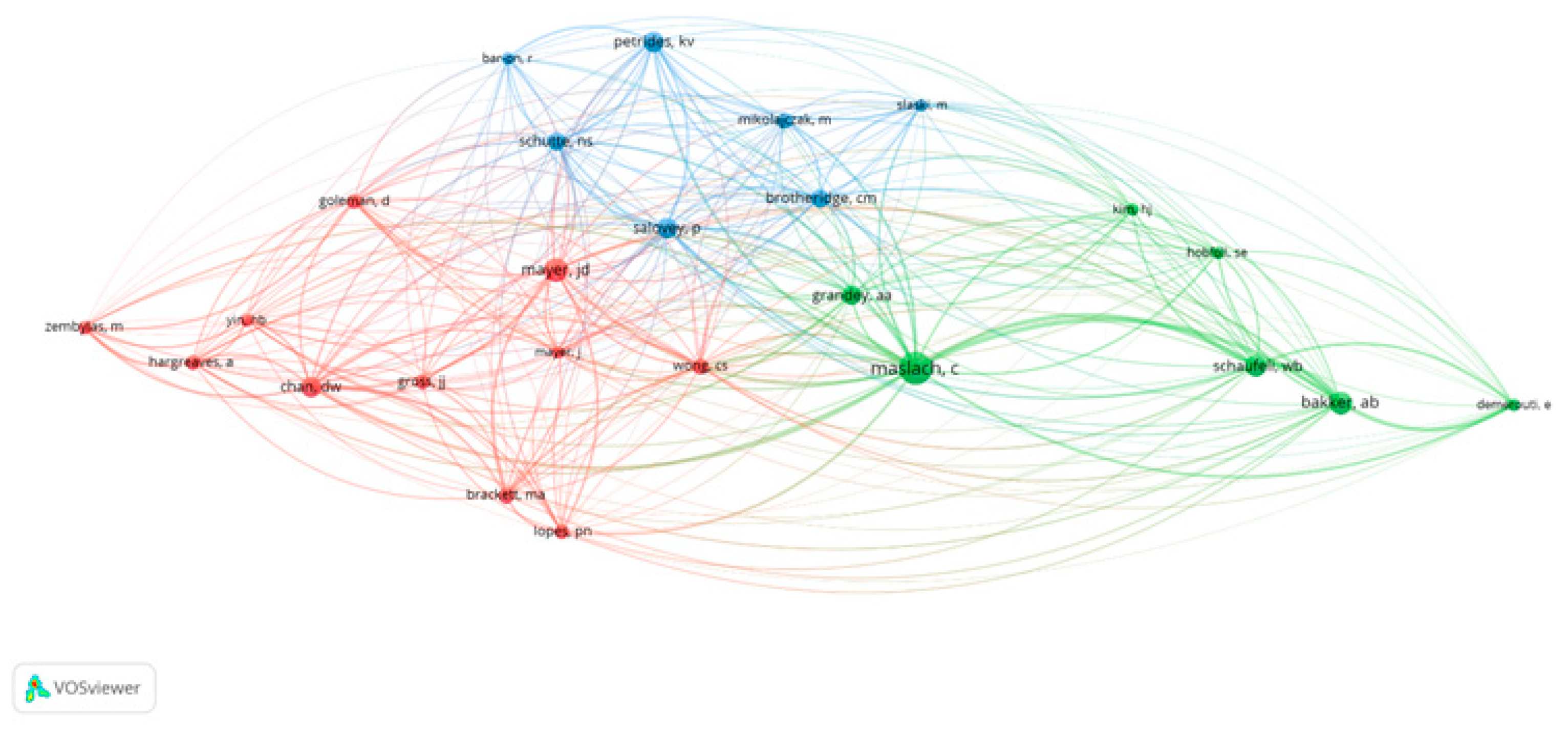 To address this gap, the present study combines applied analysis with a bibliometric mapping of the relationships among these concepts. A search of the Web of Science (WoS) database using “title,” “topic,” and “all fields” criteria revealed no studies addressing all three concepts together. Therefore, the WoS analysis focused on studies involving emotional intelligence and burnout. Based on 540 studies published between 2004 and 2025, the analysis showed that these concepts appeared mostly in independent clusters, that the number of studies relating them was limited, and that scholarly interest was concentrated in specific years. Interest in these concepts increased after the 2000s as digitalization gained momentum. However, the continued scarcity of studies specifically focused on healthcare highlights the originality and significance of the current research.