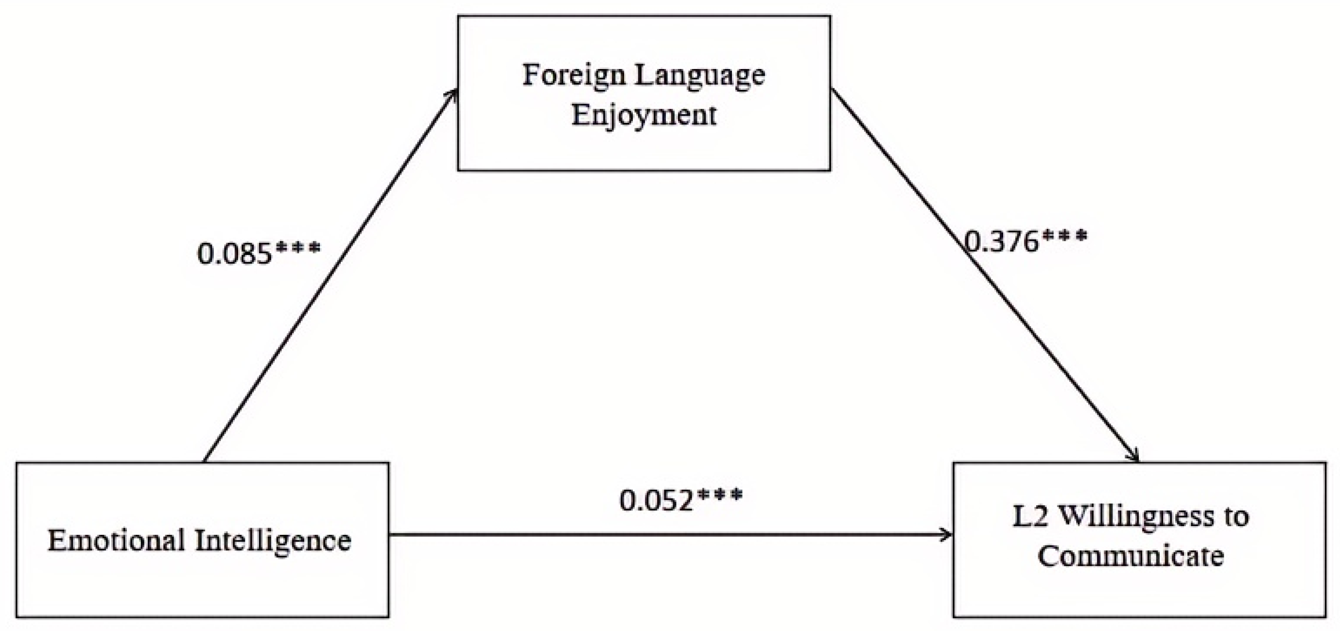 Chicago/Turabian StyleXiao, Zheying, and Jia Jia. 2025. "The Relationship Between College Students’ Emotional Intelligence, Foreign Language Enjoyment, and L2 Willingness to Communicate: A Variable-Centered and Person-Centered Perspective" Behavioral Sciences 15, no. 11: 1508. https://doi.org/10.3390/bs15111508