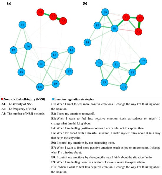 Network structure models of NSSI and emotion regulation strategies for secondary school and university students. Green lines represent positive correlations, and red lines represent negative correlations. The thickness of the lines indicates the strength of the correlations. (a) The network structure based on the group of 378 secondary school students. (b) The network structure based on the group of 593 university students.