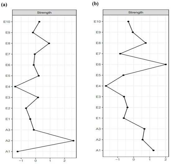 Subsequently, this study calculated the centrality of the network nodes. The results are shown in Figure 2. Figure 2a shows the strength centrality of the network of NSSI and emotion regulation strategies for secondary school students. It was found that symptom A2, “The frequency of NSSI,” had the highest strength, followed by symptom E8 “I control my emotions by changing the way I think about the situation I’m in.” The CS coefficient for node strength was 0.67, which is greater than 0.50. Figure 2b shows the strength centrality of the network of NSSI and emotion regulation strategies for university students. The results showed that symptom E6, “I control my emotions by not expressing them,” had the highest strength, followed by symptom A1, “The severity of NSSI.” The CS coefficient for node strength was 0.75, also greater than 0.50. These results indicated that the central nodes in the networks of both secondary school and university students exhibited good stability.