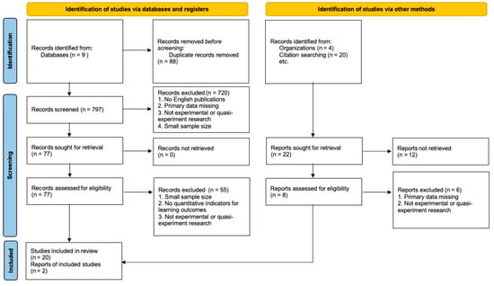 Following the PRISMA guidelines (Page et al., 2021), a computer-based search of electronic research databases for empirical studies between 2011 and 2021 for SEL programs was conducted. More specifically, the current study utilized the following strategies to locate the potential studies included in the current review. First, we searched several databases: Academic Search Complete, Academic Search Elite, Academic Search Premier, Education Full Text (H.W. Wilson), ERIC, APA PsycARTICLES, APA PsycINFO, Web of Science, and Google Scholar. The following search terms and their variants were used: social–emotional skills, social–emotional learning, SEL, social–emotional competence, social–emotional intelligence, social–emotional programs, psychosocial, social skills, emotional intelligence, academic achievement, elementary school, middle school, primary school, secondary school, and interventions. These search terms were crossed with the age group of interest (children* and adolescents*) and design of study (intervention, quasi-experimental study). Second, we searched the possible SEL programs by using program names (e.g., PATH, INSIGHTS, RULLER, 4Rs, and MindUP). Third, we searched for potential gray literature produced by organizations that promote SEL (e.g., CASEL, OECD, Yale Center for Emotional Intelligence, and the Partnership for 21st Century Learning). Fourth, some SEL program developers or researchers were contacted through email to ask for additional missing studies or data. Last, we utilized the snowballing method to find additional relevant studies that were not in the databases but referenced in the selected articles. The literature search was completed between 4 January 2022, and 25 February 2022.