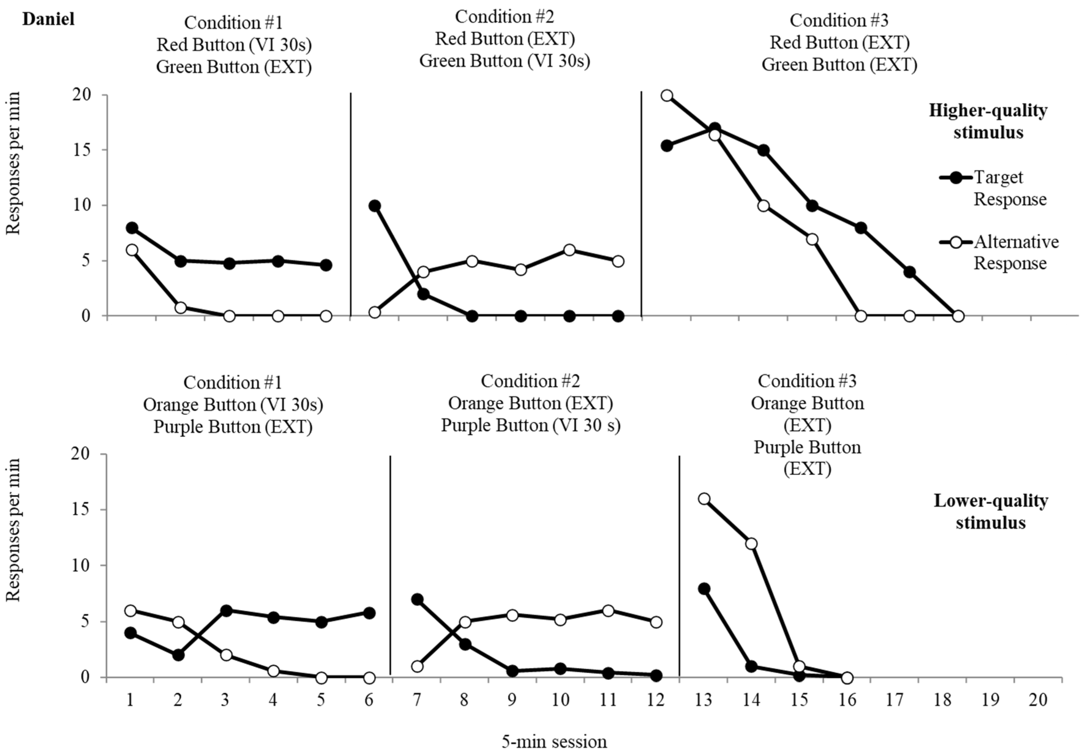 Figure 4 depicts data from the lower-quality stimulus’ resurgence analysis for Diego, Daniel, and Tilly, respectively. During the first condition, button presses to the target response resulted in an average of 29.3 rpm (Diego), 4.7 rpm (Daniel), and 12.0 rpm (Tilly), while responses to the alternative response, which resulted in extinction, remained low throughout the condition (Diego