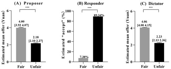 Manipulation checks confirmed successful fairness reputation assignments for proposers, responders, and dictators. The participants’ estimated offers closely matched the predefined values for proposers and dictators, and responders’ expectations aligned with the intended fairness conditions (Figure 3). The specific statistical values, including t, χ2, means, and standard errors, are provided in the Supplementary Materials.