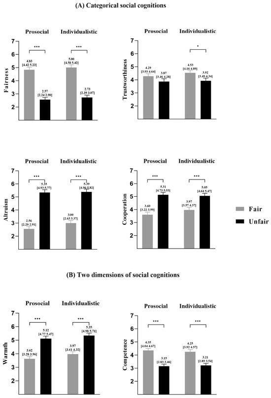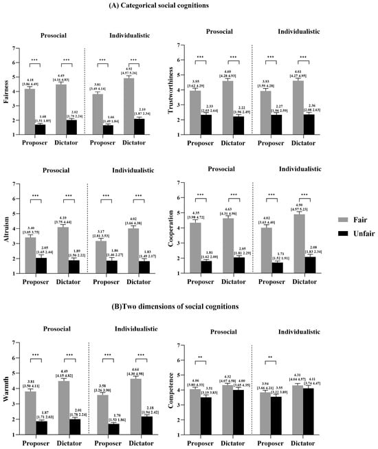 Secondly, we compared the categorical social cognition and the two dimensions of the social cognition of prosocial and individualistic participants towards different roles under different fairness reputation conditions. For the proposers and dictators, a series of 2 (fairness reputation: fair vs. unfair) × 2 (SVO: prosocial vs. individualistic) × 2 (role: proposer vs. dictator) mixed-design ANOVAs was conducted. For the responders, a series of 2 (fairness reputation: fair vs. unfair) × 2 (social value orientation: prosocial vs. individualistic) mixed-design ANOVAs was conducted. For the sensitivity power analysis, N = 122, α = 0.05, power (1 − β) = 0.90, detected minimum effect sizes of f = 0.13 for the 2 × 2 × 2 mixed ANOVAs, and f = 0.16 for the 2 × 2 mixed ANOVAs. The above details of the sensitivity power analysis are explicitly reported in the Supplementary Material. All reported significant effects exceeded this threshold, suggesting they were sufficiently powered. However, we acknowledge that this study may be underpowered to detect very small interaction effects. Where applicable, we used the Welch/Kenward–Roger corrections via the afex package (version 1.3-1) in R to ensure robust inference in the presence of potential heteroskedasticity. To control for type I error inflation due to multiple correlated dependent variables, we applied Holm–Bonferroni corrections within the logical hypothesis families. For each experimental hypothesis (e.g., the main effects of fairness reputation, SVO, role, and their interactions), corrections were applied across the six dependent variables (fairness, trustworthiness, altruism, cooperation, warmth, and competence). All reported p-values reflect these conservative corrections.