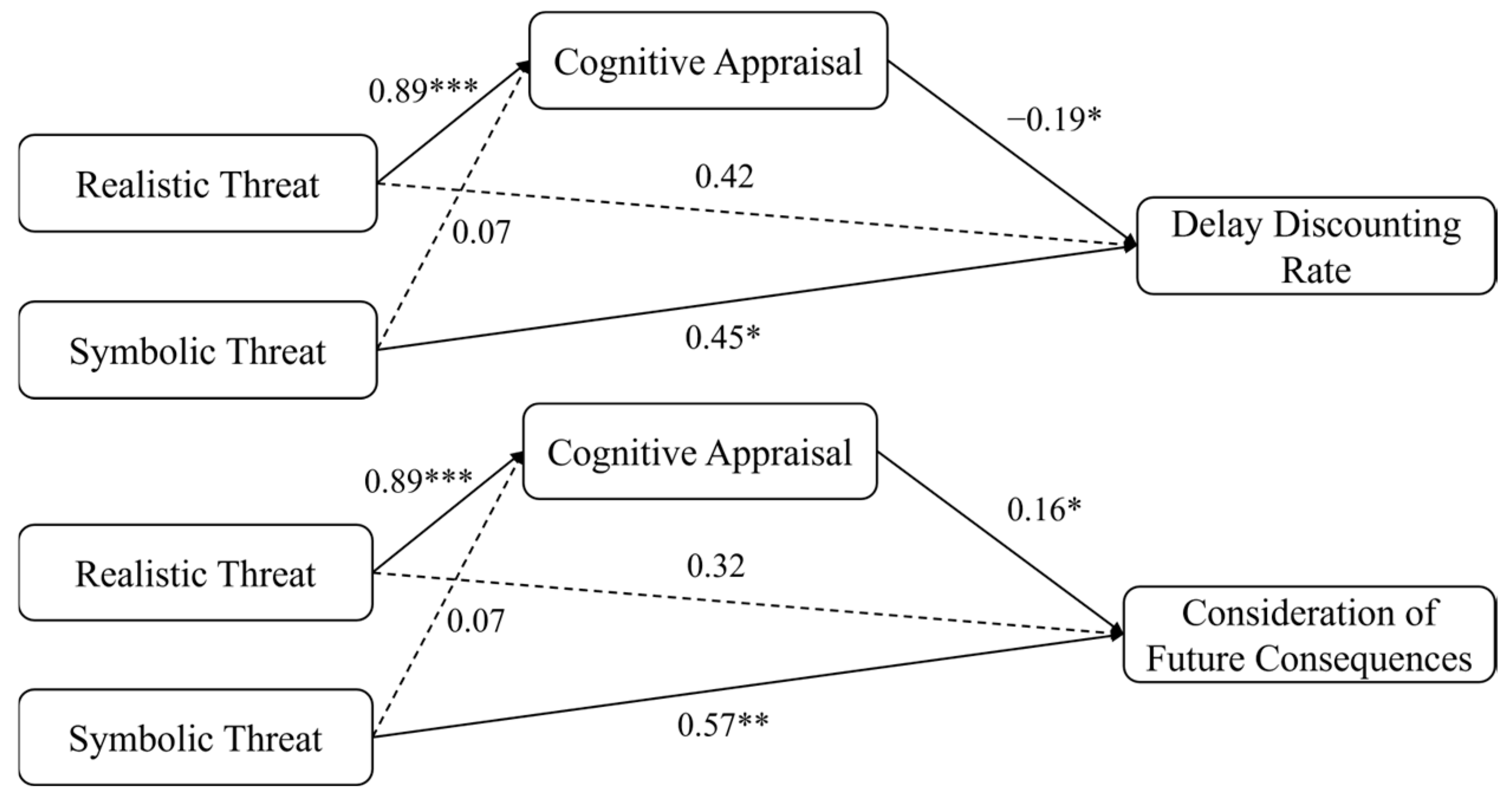 | Symbolic Threat → Delay Discounting Rate | 0.779 * | 0.34 | [0.11, 1.45] |