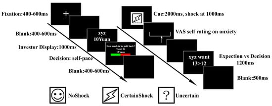 Participants were instructed to act as trustees. Each trial began with a fixation in the center of the screen. After receiving an investor’s CNY 10 and turning it into CNY 30, the trustee had to decide the amount of money to be paid back to the investor. Then, one of three cues would appear, indicating investor’s intention to punish the trustee or not. A smile icon serves as NoShock cue, a lightning icon as Shock cue, and a question icon as cue for Uncertain. The icon images are drawn with black lines on a white background. Three images are with similar luminance (241.8, 243.1, and 245.7 gray level) and contrast (54.4, 51.8, and 45.9 gray level). Following the implementation of shock or non-shock, the trustee was asked to rate the level of anxiety at the moment of seeing the cue, via a visual analogue scale (VAS). Finally, a contrast of the expected monetary payback of the investor against the actual payback was presented.