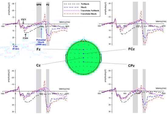 The grand average across participants of ERP for each condition at four electrodes is shown above. The onset of Cue is set at 0 ms, and potential shock happens at 1000 ms. Time windows for SPN and P2 components are signified by gray color in the image. NoShock indicates there is no punishment, and Certain-Shock indicates definitive shock punishment. Uncertain-NoShock represents there is no punishment after the uncertain cue, and Uncertain-Shock represents there is electric punishment after the uncertain cue.