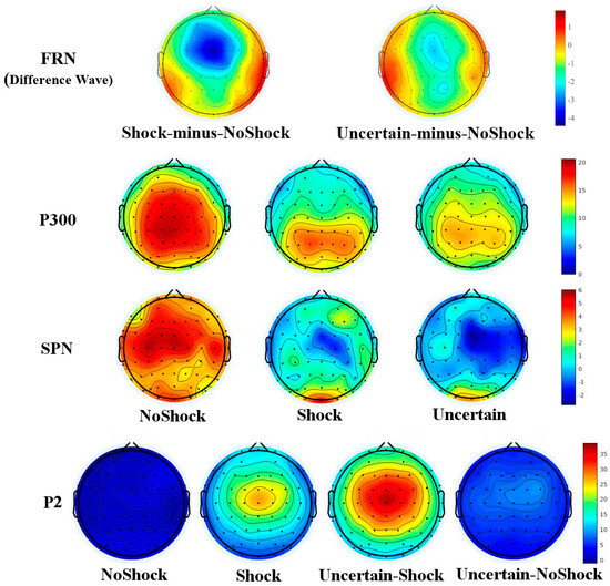 From the brain topography, it can be observed that the strongest activation points of both FRN and SPN components are located in the four midline fronto-central electrodes (FZ, FCZ, CZ, and CPZ) region. From the P300 topography, under the NoShock condition, a large central parietal region is active; in the Shock and Uncertain conditions, the activated areas are mainly located in the parieto-occipital region. The topography also shows that the most active sites for the P2 wave induced by both Shock and Uncertain-Shock are located at the top of the head (FCZ and CZ electrodes), with the P2 amplitude gradually weakening from the central top area towards the periphery.