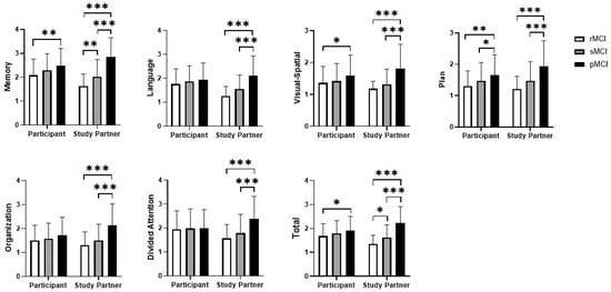 A mixed-design ANOVA was conducted to compare ratings between two sources (participants and study partners, as the within-subjects factor) and across three MCI groups (pMCI, rMCI, sMCI, as the between-subjects factor) on the Ecog scales. Significant main effects were observed across all subscales (Table 2, Figure 1). Group-wise analyses indicated that Memory and Total scale scores could differentiate all three groups, whereas other scale scores only distinguished the pMCI group the rMCI and sMCI groups. No significant main effect was observed for source (self vs. informant). However, a significant interaction between group and Ecog source suggested that group influenced the discrepancies between self and informant-assessments. Self-reported Language, Executive, and Attention did not differ significantly across groups, while other self-reported subscales showed at least one significant pairwise difference. In contrast, all informant-reported subscales significantly distinguished rMCI and sMCI from pMCI, with Memory and Total scores further differentiating rMCI from sMCI. These results indicate that informant ratings in these domains effectively distinguish among the three MCI subtypes (p < 0.05, Bonferroni-corrected).