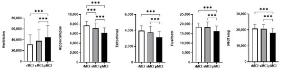Group differences in brain region volumes among the three MCI subtypes. Significance levels: *** p < 0.001. Abbreviations: Entorhinal: entorhinal cortex; Fusiform: fusiform gyrus; MidTemp: middle temporal gyrus.