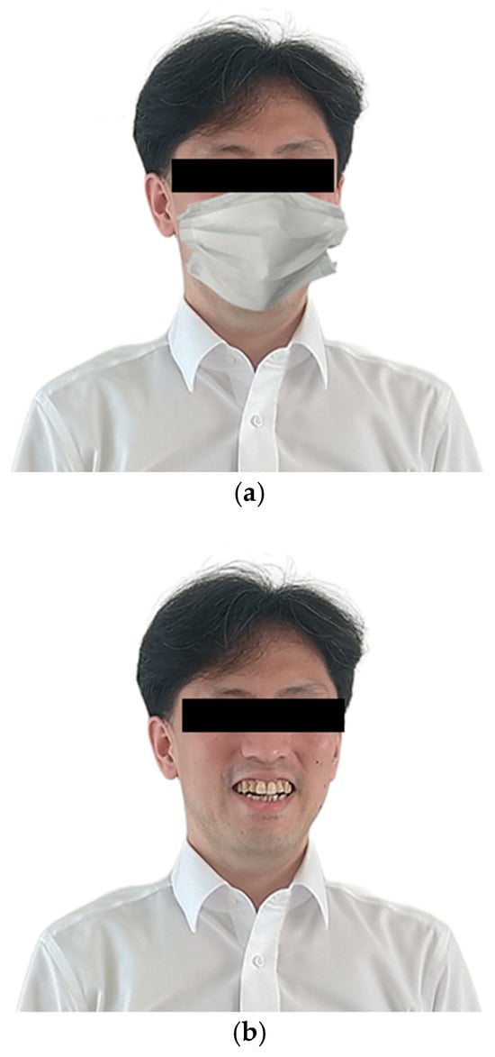 Examples of facial stimuli (a) with and (b) without a mask. Note that images shown in this figure are the examples created by the authors and were not actually used in the experiment. The eyes in the example images are covered with a black bar to prevent personal identification; black bars were not present in the actual experimental stimuli.